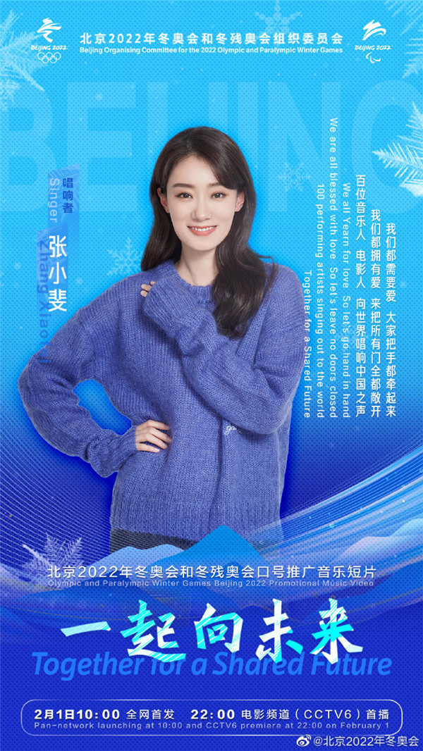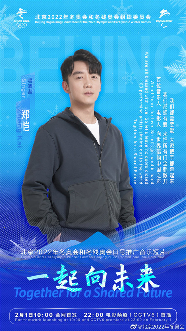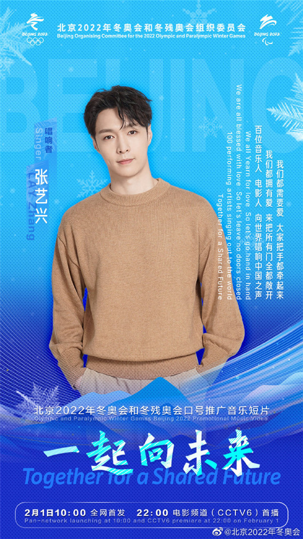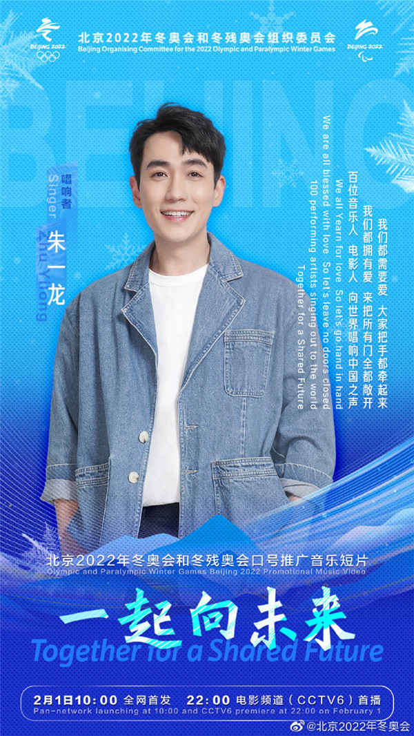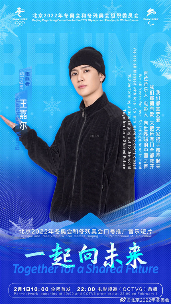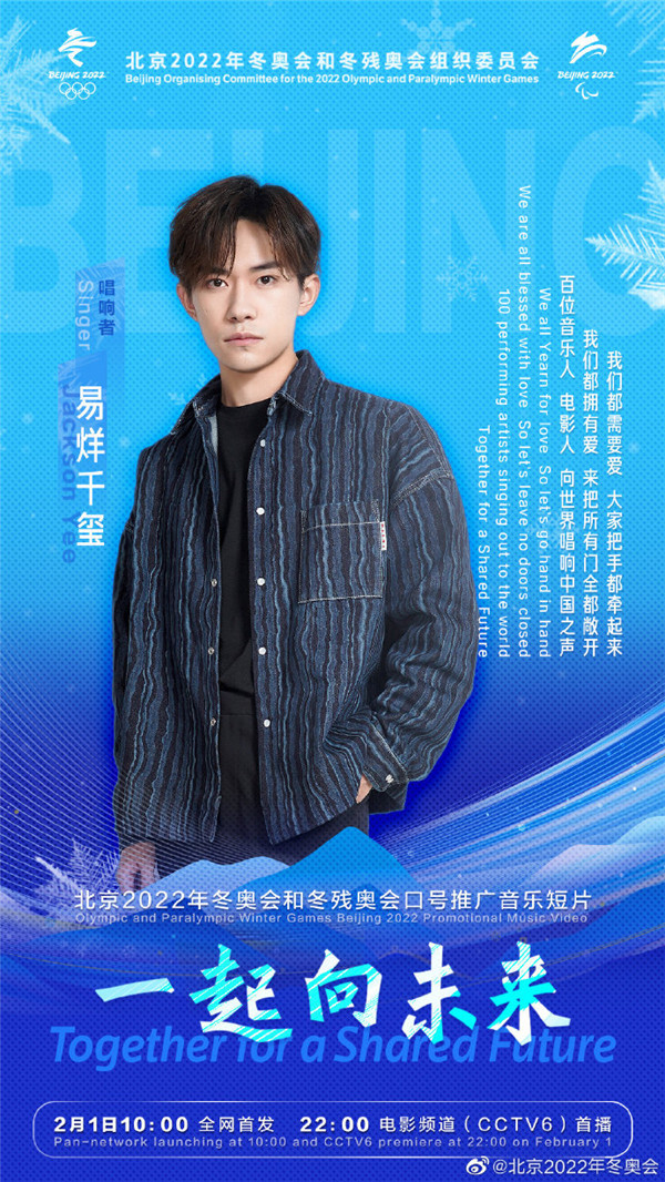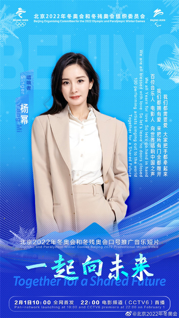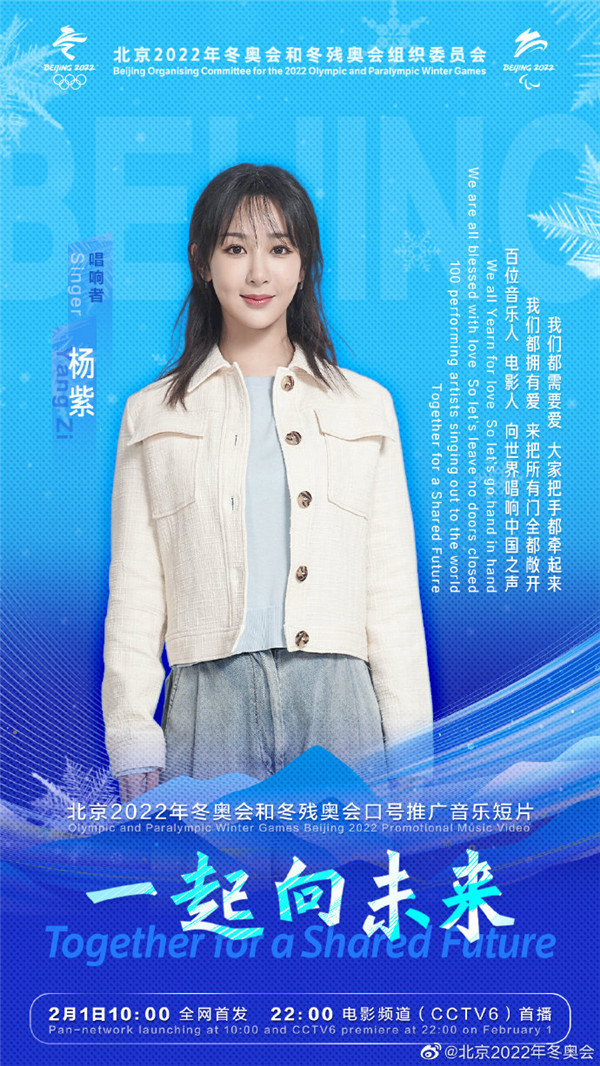 據北京2022年冬奧會官方微博今日(26日)消息,北京2022年冬奧會和冬殘奧會口號推廣音樂短片《一起向未來》,將於2月1日10:00全網首發, 22:00電影頻道(CCTV6)首播。百位音樂人、電影人將向世界唱響中國之聲。一起向未來音樂短片的第二波陣容包括王嘉爾、楊冪、楊紫、易烊千璽、等藝人。