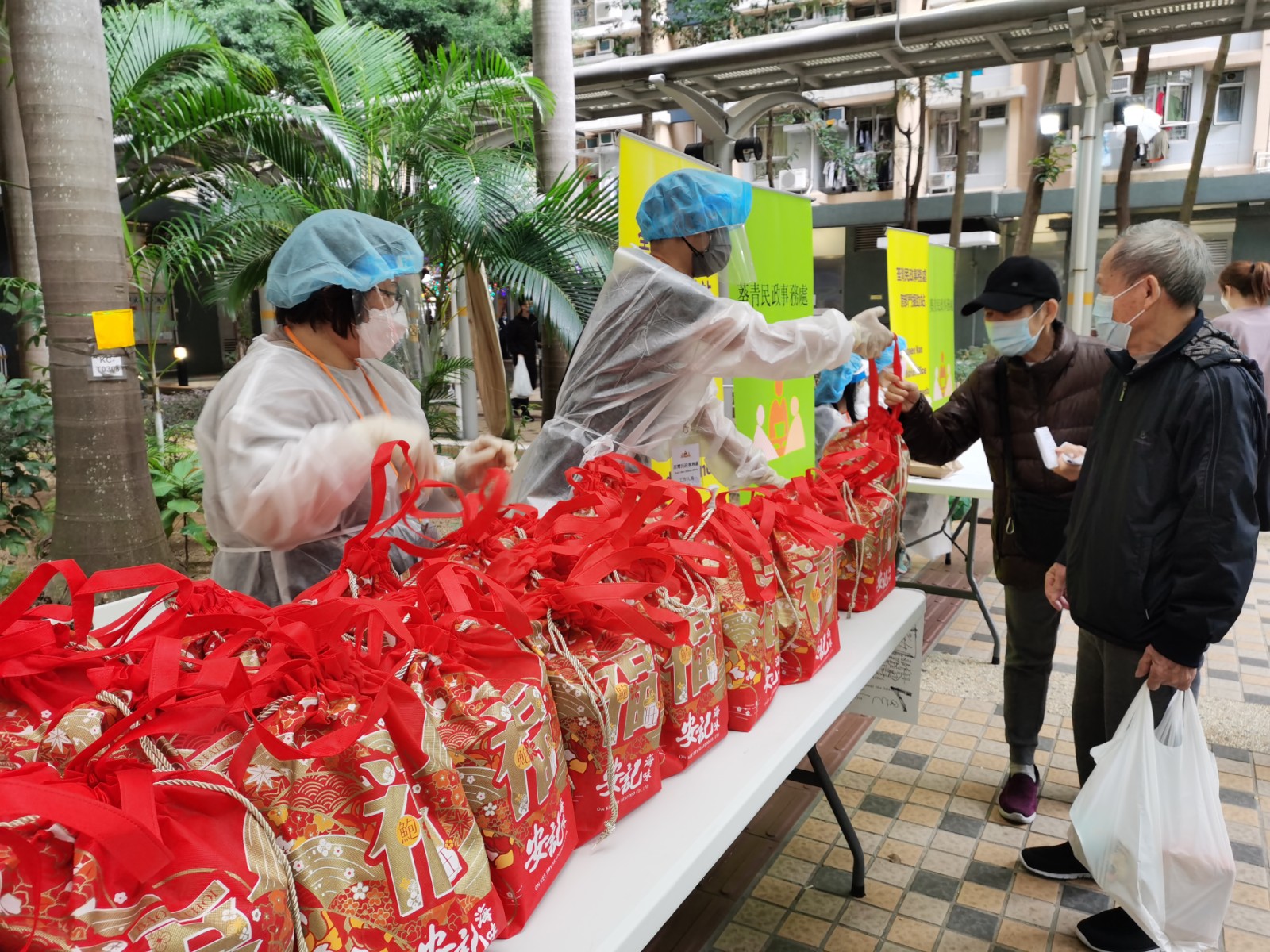 當局在信箱派發感謝信,感謝居民配合圍封行動,民政事務處在現場給每家住戶派發新年福袋,裏面有臘腸、花菇和罐頭鮑魚等賀年食品。