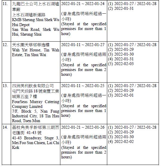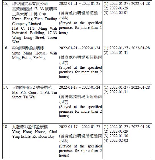 因應10宗與本地個案有關的個案、2宗與輸入個案有關的個案,以及6宗初步陽性檢測個案,有21個指明地方被納入強制檢測公告,包括彩雲(一)邨,及其商場;九龍灣彩盈邨盈康樓、筲箕灣明華大廈B座、九龍城龍譽1B座、長沙灣副食品批發市場、將軍澳海悅豪園商場地下真味鮮廚、九巴上水石湖墟車廠,及慈雲山保良局第一張永慶中學等。港府強烈提醒市民必須嚴格遵守強制檢測要求,按時完成須多次進行的強制檢測。