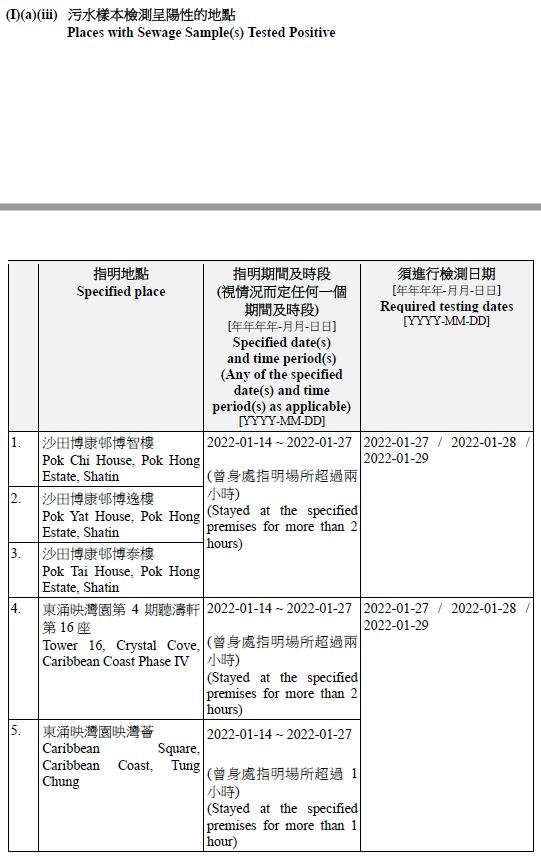 另外,因應在沙田及東涌採集到檢測呈陽性的污水樣本,有5個指明地方被納入強制檢測公告,包括沙田博康邨博智樓、博逸樓、博泰樓、東涌映灣園第4期聽濤軒第16座、映灣園映灣薈。