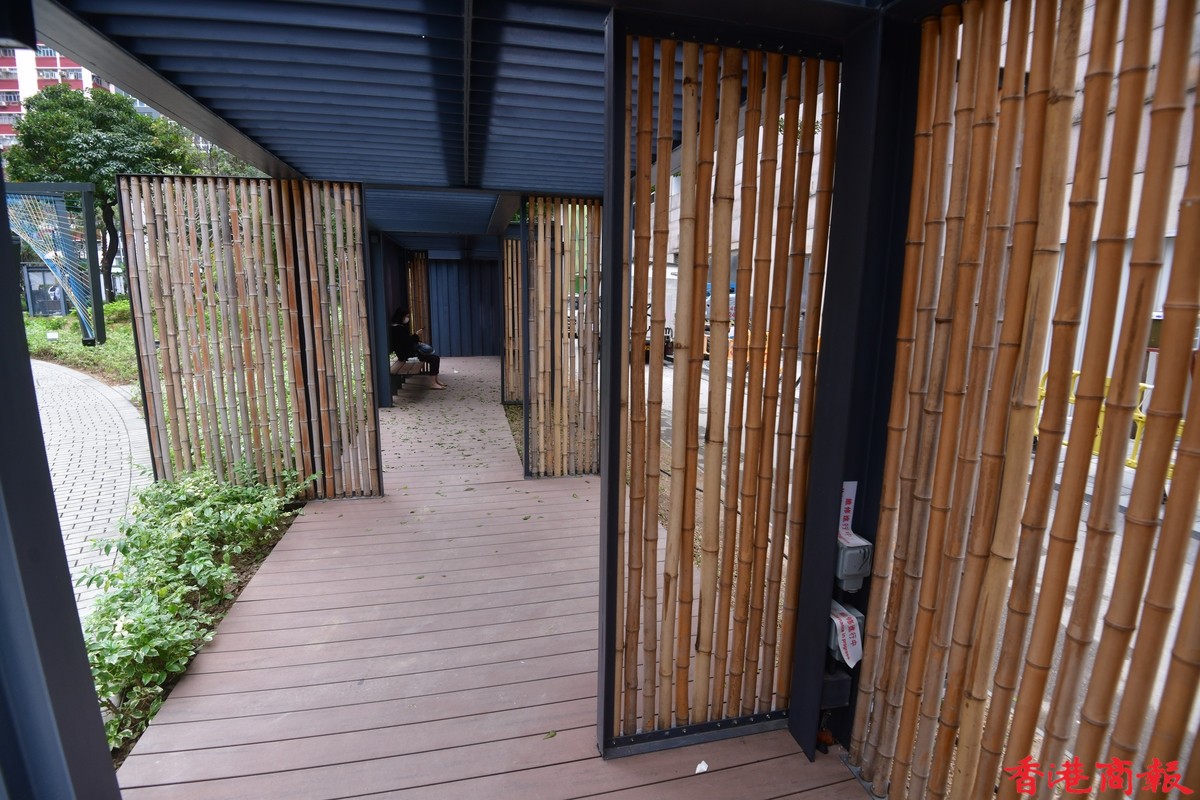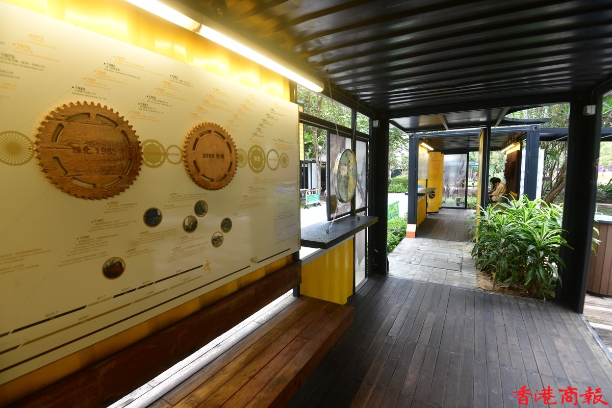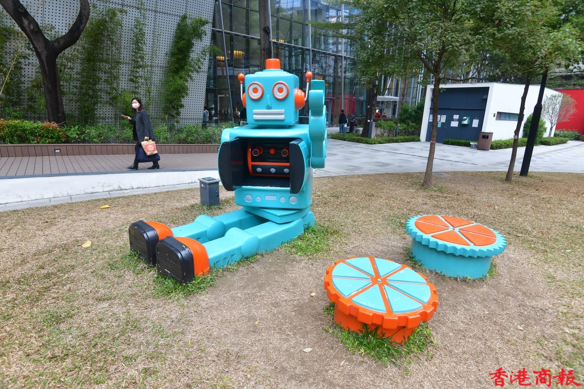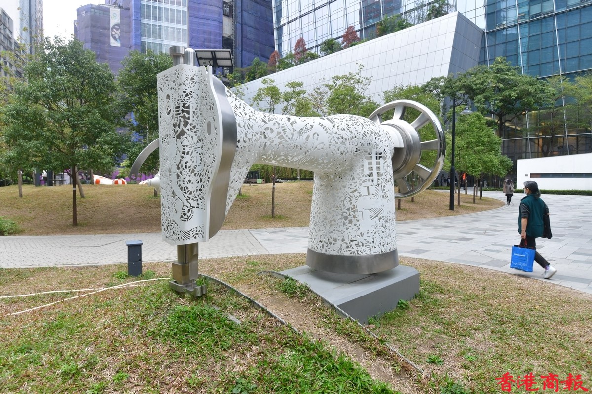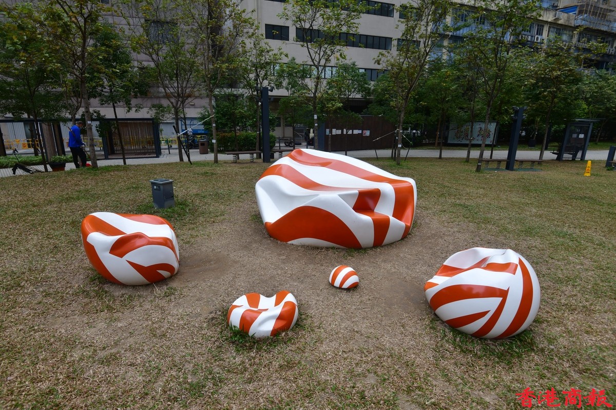 公園內有多個大型得意裝飾,在草坪上有一部超大型衣車如在縫製衣物中,就如向昔日的本地縫紉製衣業作出致敬;附近另有一條小徑,頂部似由紡織而成,模彷著紡、織、染、印四個重點步驟,突顯紡織業特色。公園內的坐椅更為特別,有似西瓜波物料外型,也有大鐵人款式,在現代化的工業區內尋找到點點往日的工業風,讓人懷緬工業蓬勃璀燦。(記者 崔俊良/攝)