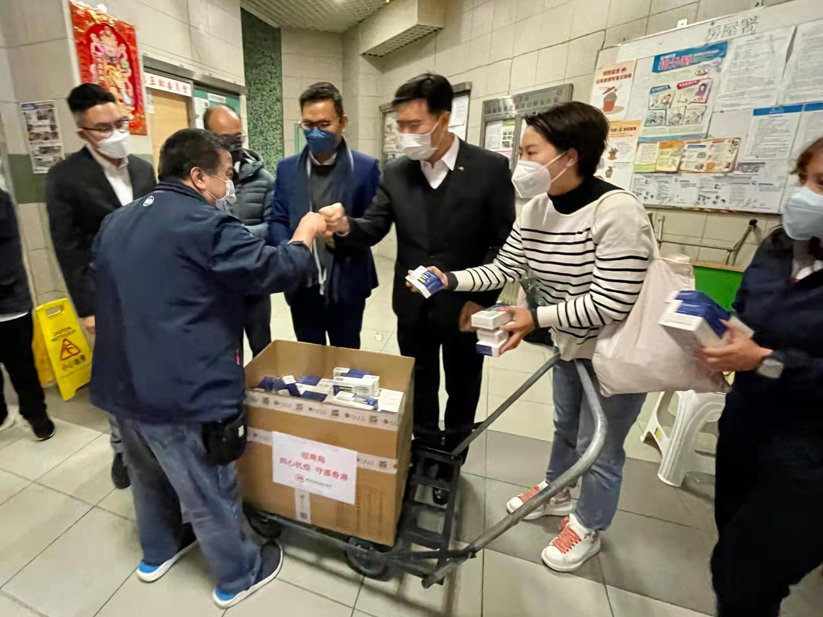 在物資派發現場,招商局港口控股公司董事總經理、立法會議員嚴剛,立法會議員陳恆鑌、招商局創毅控股有限公司執行董事潘建良等和義工一道進行物資分裝,發放給有需要的社區居民及前線工作人員,同時向心懷大愛、無私奉獻的義工隊致以佳節慰問。