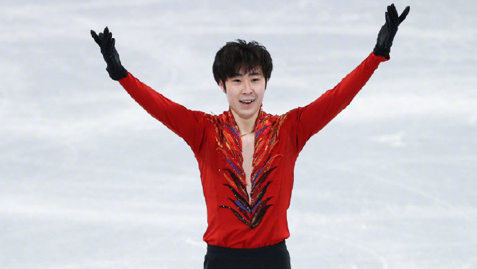 2月10日,金博洋在花樣滑冰男子單人滑自由滑比賽中亮相,表演曲目為《波來羅舞曲》。