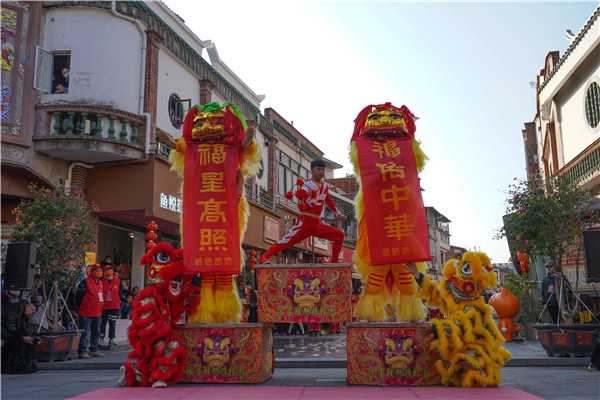當天下午,中山路的街道里人頭攢動、觀者如市,讓人忍不住駐足期待,「開始了,開始了……」伴隨着陣陣鑼鼓聲,幸福民俗快閃活動之一的「醒獅送福」,在金魚巷口拉開泉州鬧元宵習俗中踩街活動的序幕。