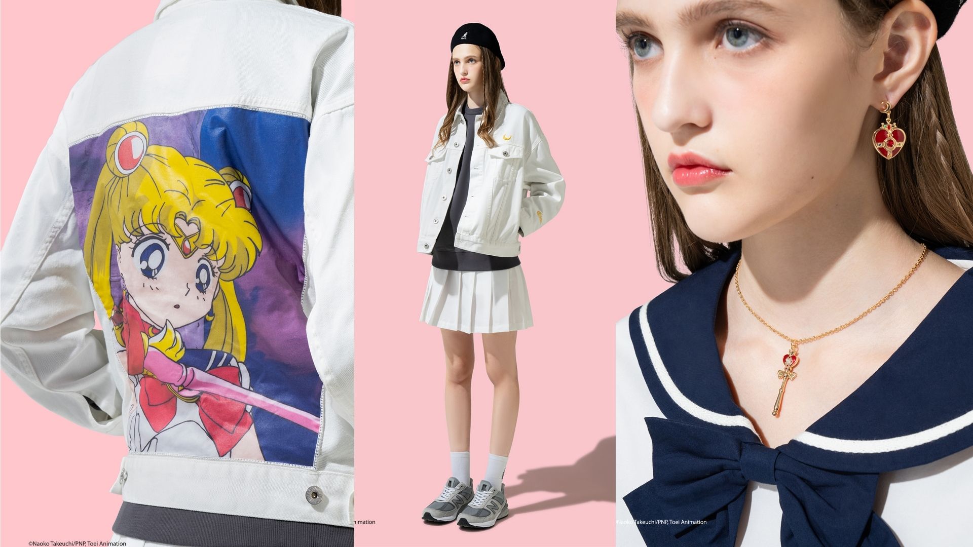 系列整體設計遊走於甜美粉色系及型格風之間,除衛衣及Tee外,還有角色印花夏威夷恤及Photoprint拼布牛仔褸,另外以美少女戰士的校服作設計藍本的水手裝也十分搶眼,屬粉絲不可錯過的單品。除了各款服飾外,還有一系列美少女戰士配飾,如螺旋愛心變身器化身而成的頸鏈、耳環飾物組合、以月野兔經典的變身剪影作設計的燙金玻璃茶具套裝等。
