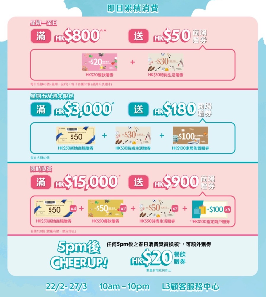 此外,商場同時推出消費獎賞,送出逾HK$1000贈券,適用於時尚服飾、美妝護理、影音器材、家居用品、個人護理等。星期一至日買滿HK$800賞HK$50商場贈券、星期五及周末限定買滿HK$3000賞HK$180商場贈券、每日限定獎賞買滿HK$15000賞HK$900商場贈券,任何日子下午5時後的春日消費賞換領,可額外獲HK$20商場贈券,讓市民購物時更盡興! (記者:Janice)