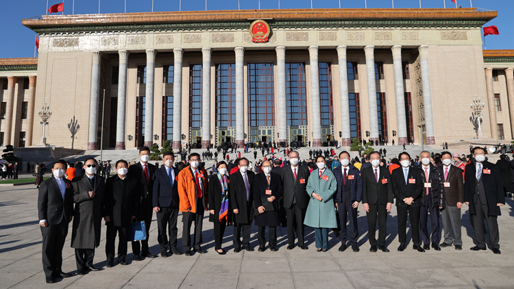 3月5日上午,十三屆全國人大五次會議開幕。香港代表團在北京人民大會堂前合影,呼籲齊心協力戰勝疫情。
