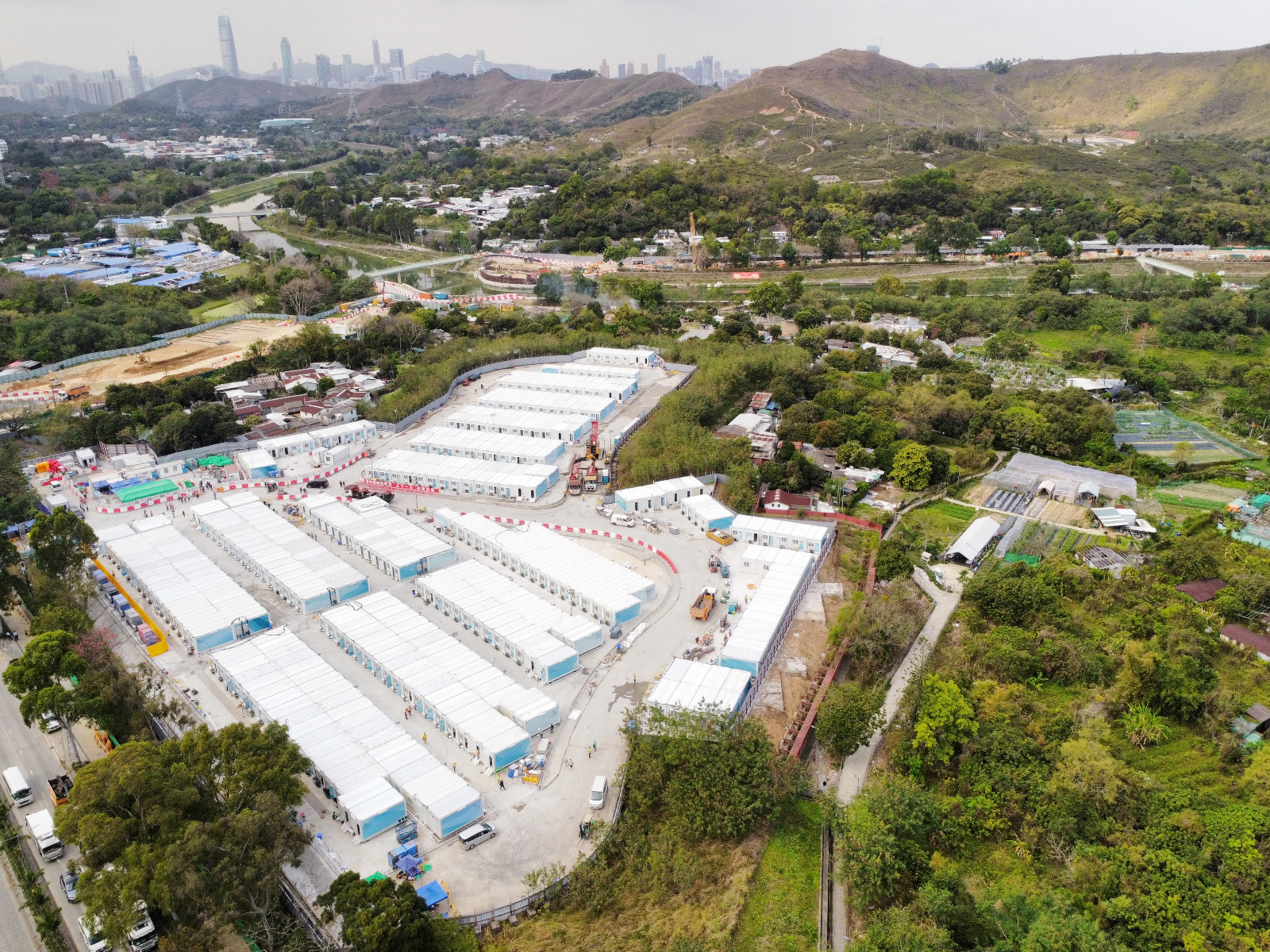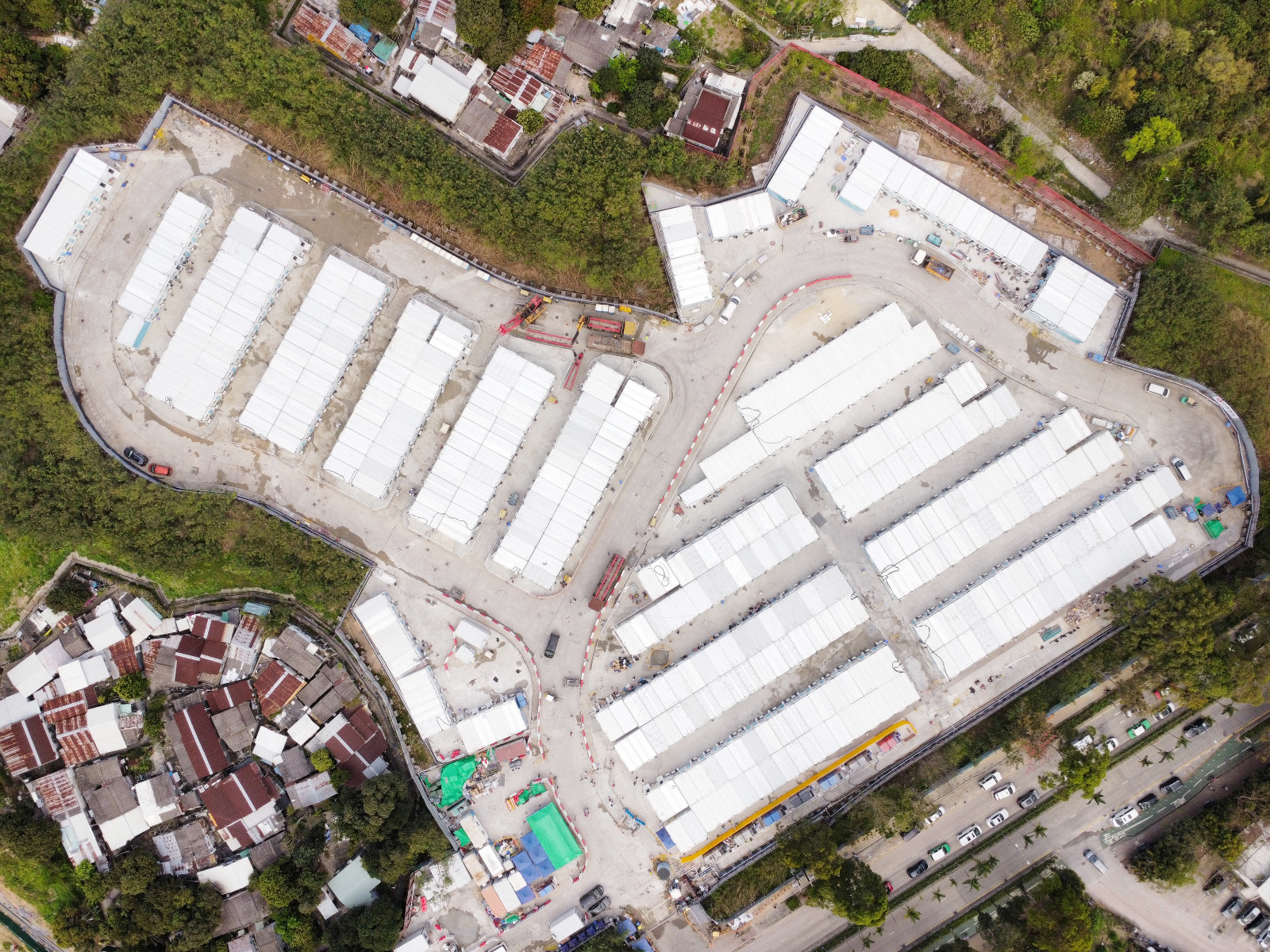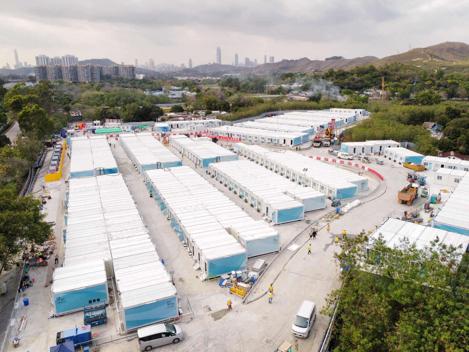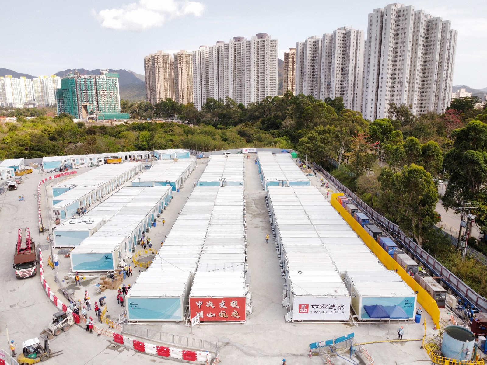 位於粉嶺馬適路的方艙醫院3月13日交付啟用,這也是中央援建香港的第四個社區隔離及治療設施。粉嶺方艙醫院工地面積約1.9公頃,由2月21日到3月11日,總建築工期為18日,共可提供1074張病床,358間隔離單位。(圖源 中通社)