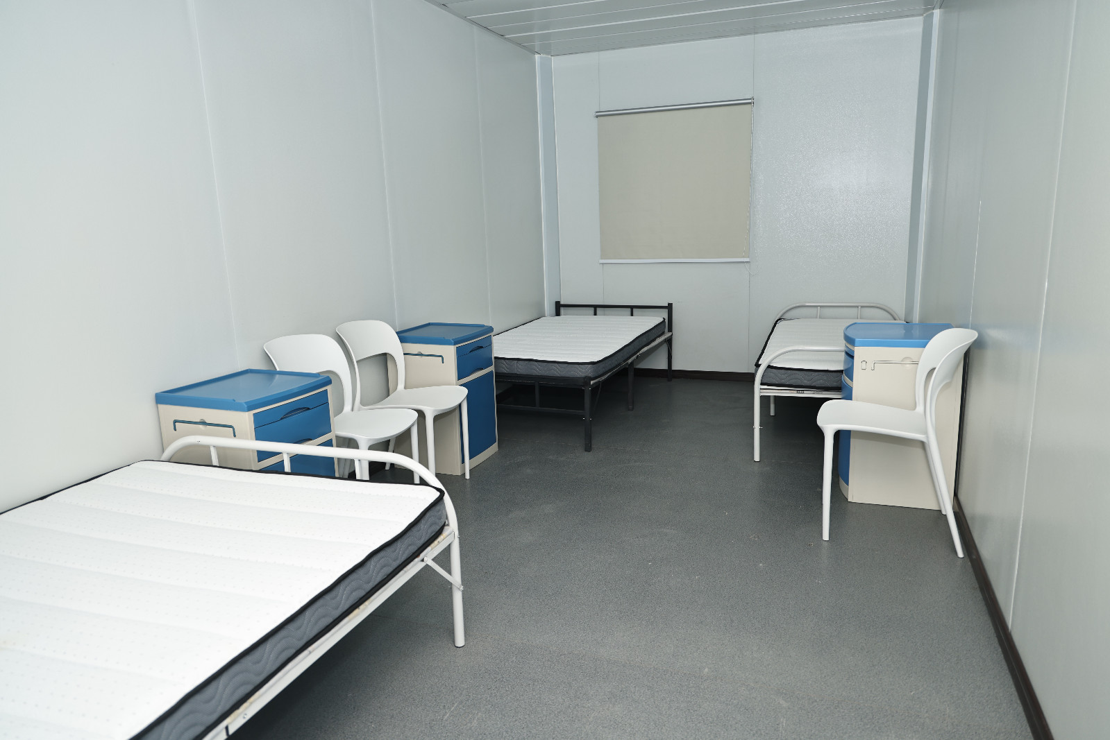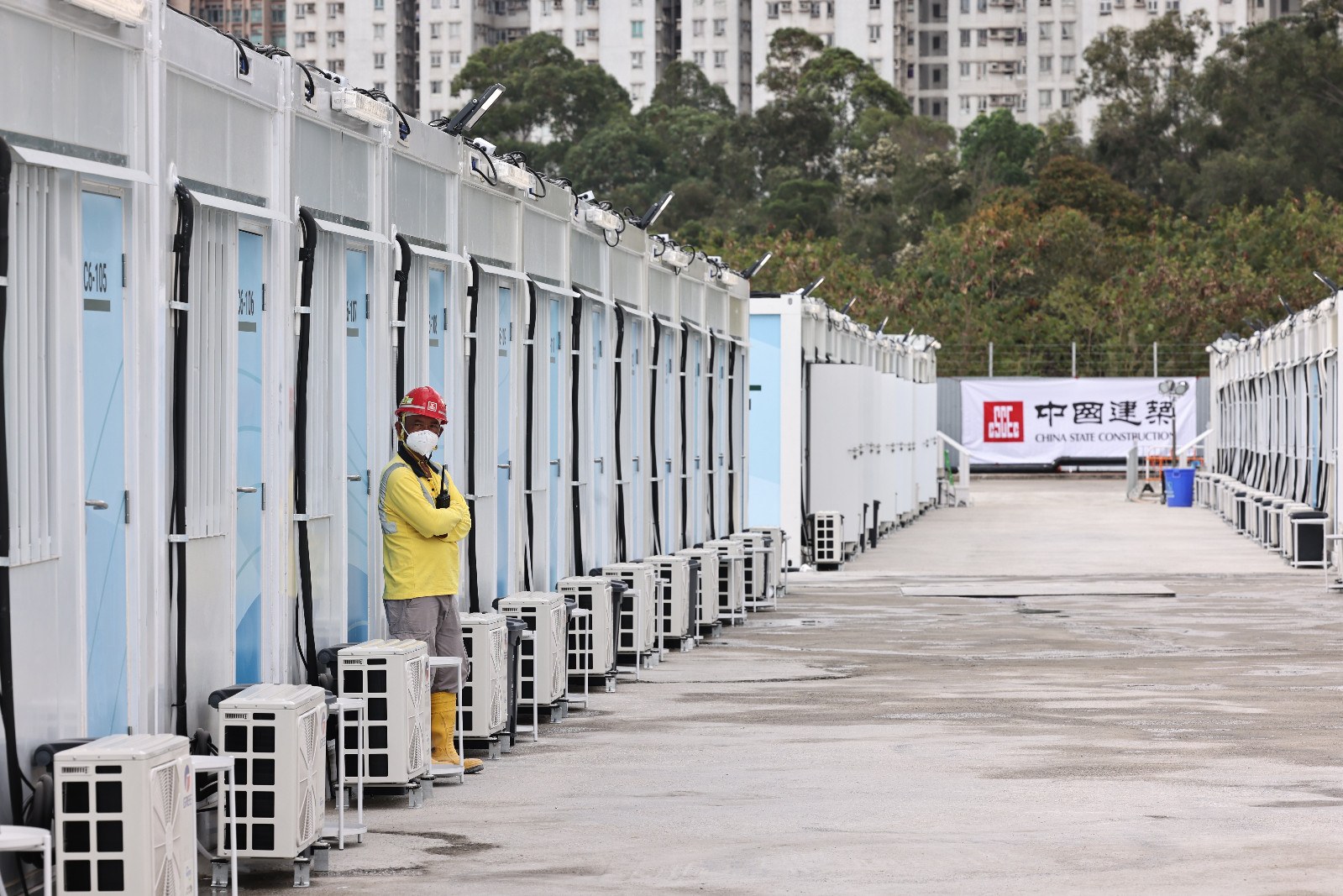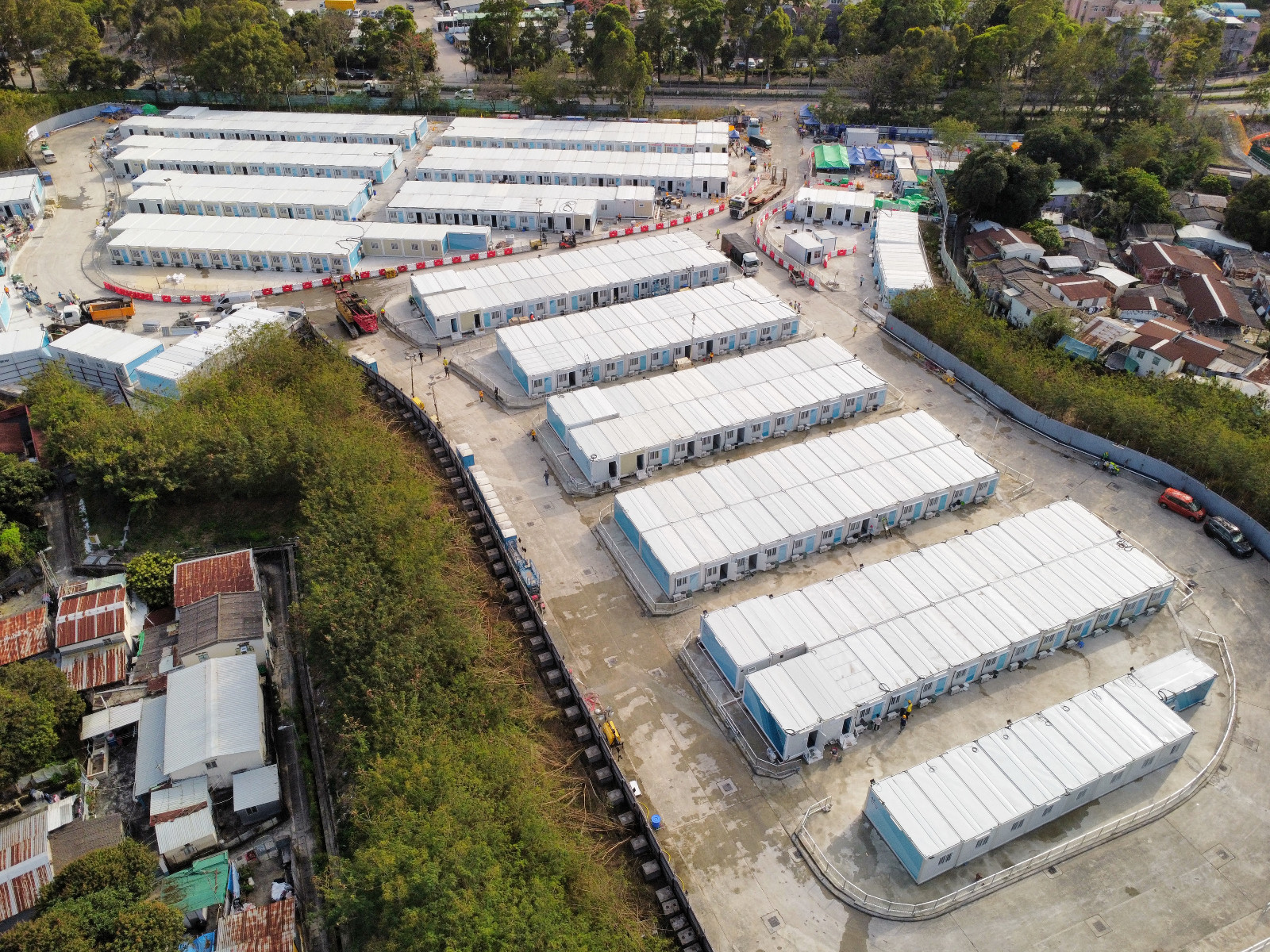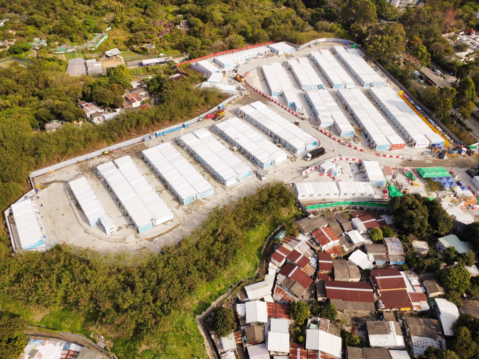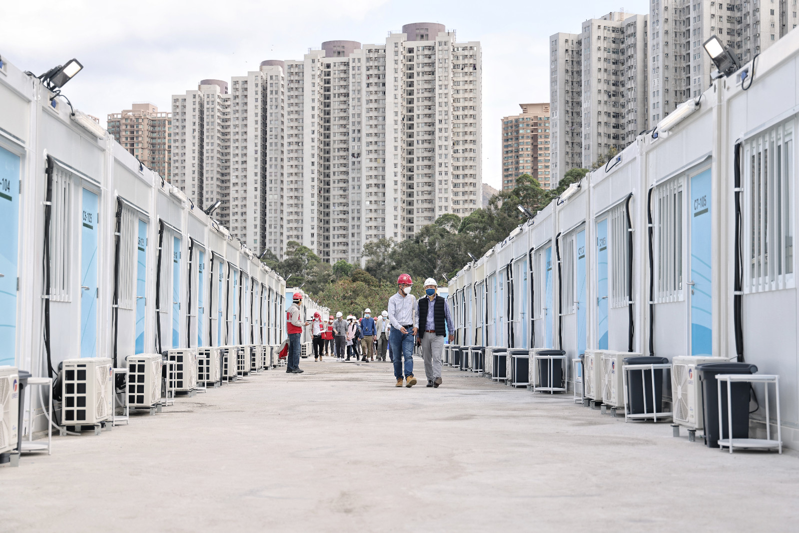 位於粉嶺馬適路的方艙醫院3月13日交付啟用,這也是中央援建香港的第四個社區隔離及治療設施。粉嶺方艙醫院工地面積約1.9公頃,由2月21日到3月11日,總建築工期為18日,共可提供1074張病床,358間隔離單位。(圖源 中通社)