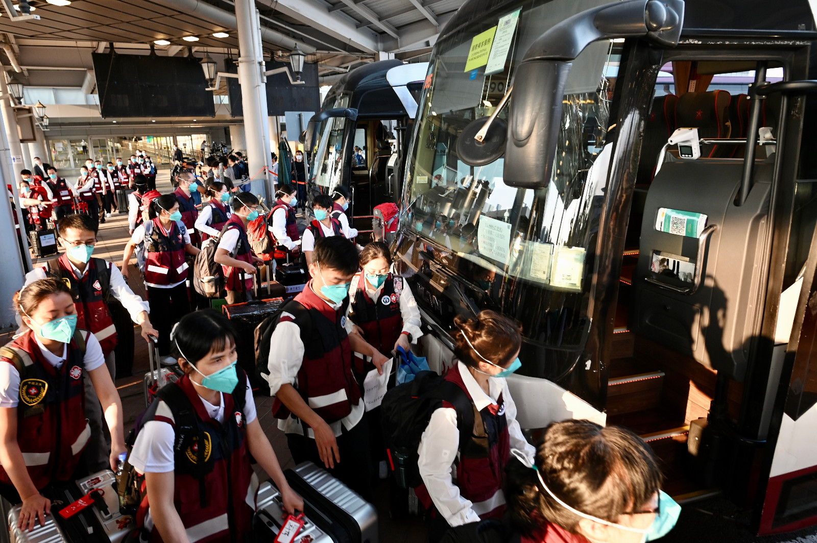 近日,第五波新冠肺炎疫情兇猛襲港,一河之隔的香港疫情形勢牽動著廣東醫護人員的心。14日下午,應香港特區政府請求,由廣東省組派的內地援港醫療隊共75人,經深圳灣口岸抵達香港,全力配合特區政府開展病人救治工作,幫助香港盡快穩控疫情。(圖源 中通社)