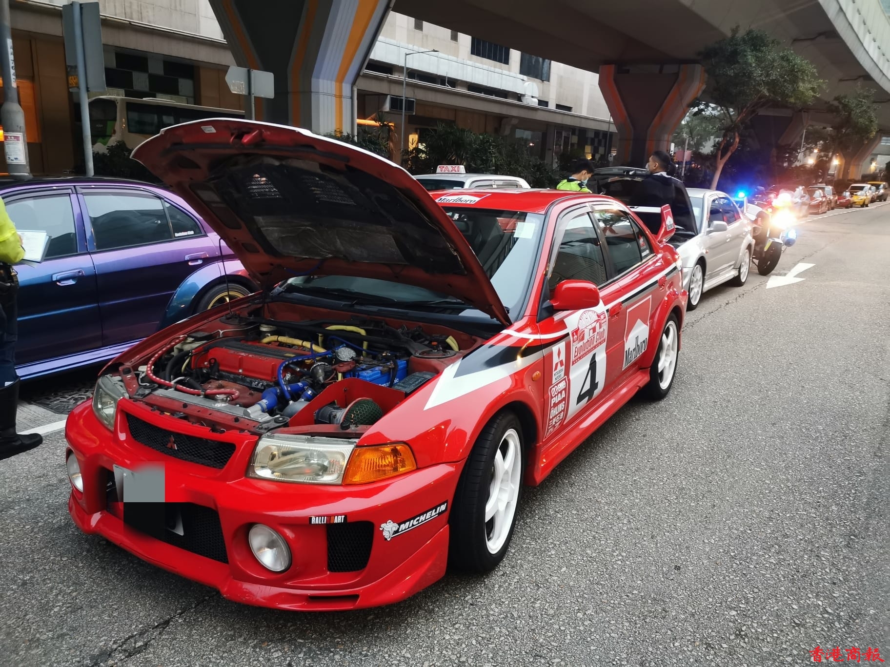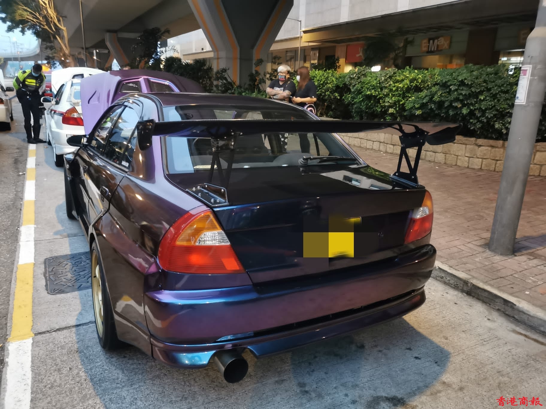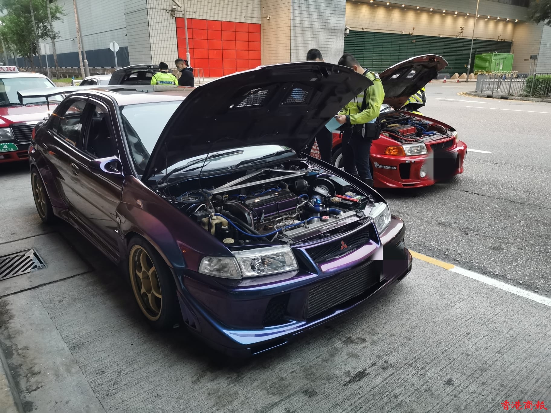 行動中,警方在九龍灣展貿徑一號對開截查車輛,發現一輛私家車懷疑被非法改裝,涉嫌違反《道路交通(車輛構造及保養)規例》。經初步檢驗後,有關車輛懷疑被改裝懸掛系統、「死氣喉」和車尾定風翼等,該車輛被拖走作進一步檢驗。此外,警方亦向另一輛車司機發出欠妥車輛報告。
