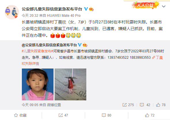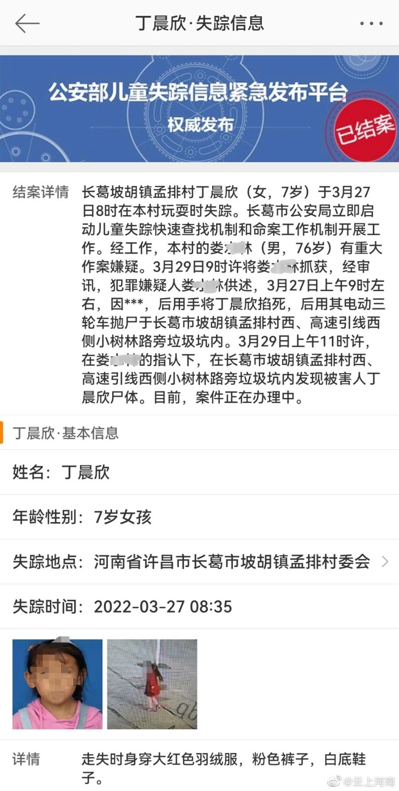 據微博「公安部兒童失蹤信息緊急發布平台」消息,長葛坡胡鎮孟排村丁某欣(女,7歲)於3月27日8時在本村玩耍時失蹤。長葛市公安局立即啟動兒童失蹤快速查找機制和命案工作機制開展工作。經工作,本村的婁某林(男,76歲)有重大作案嫌疑。3月29日9時許將婁某林抓獲,經審訊,犯罪嫌疑人婁某林供述了作案經過。警方根據其供述,於29日上午11時許在孟排村西、高速引線西側小樹林路旁垃圾坑內發現丁某欣遺體。目前,案件正在辦理中。