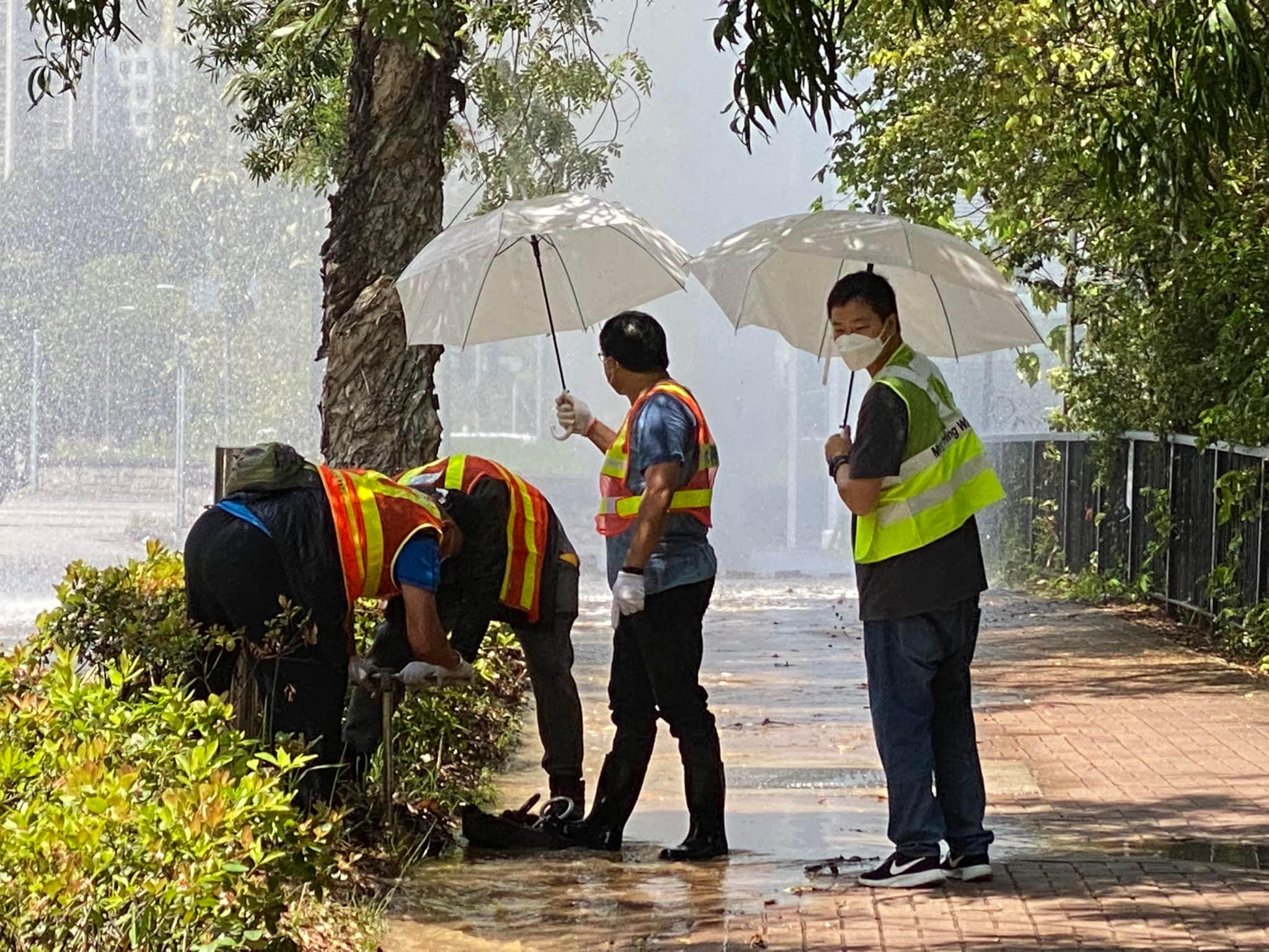 警方接報到場,先封鎖路面,並通知水務署人員,其後維修人員到場將水掣關上,並進行搶修。(記者 區天海)
