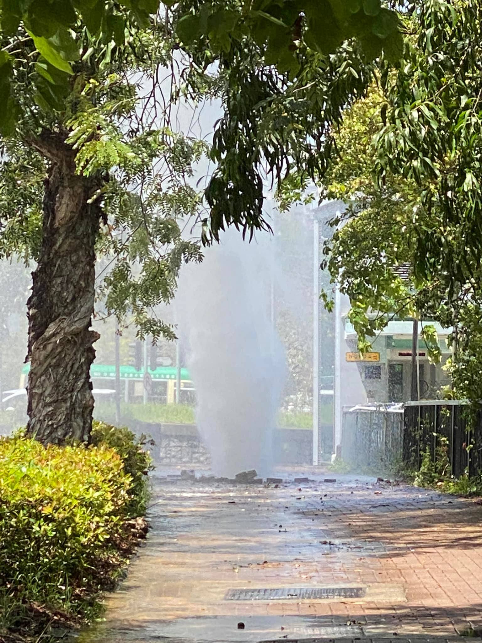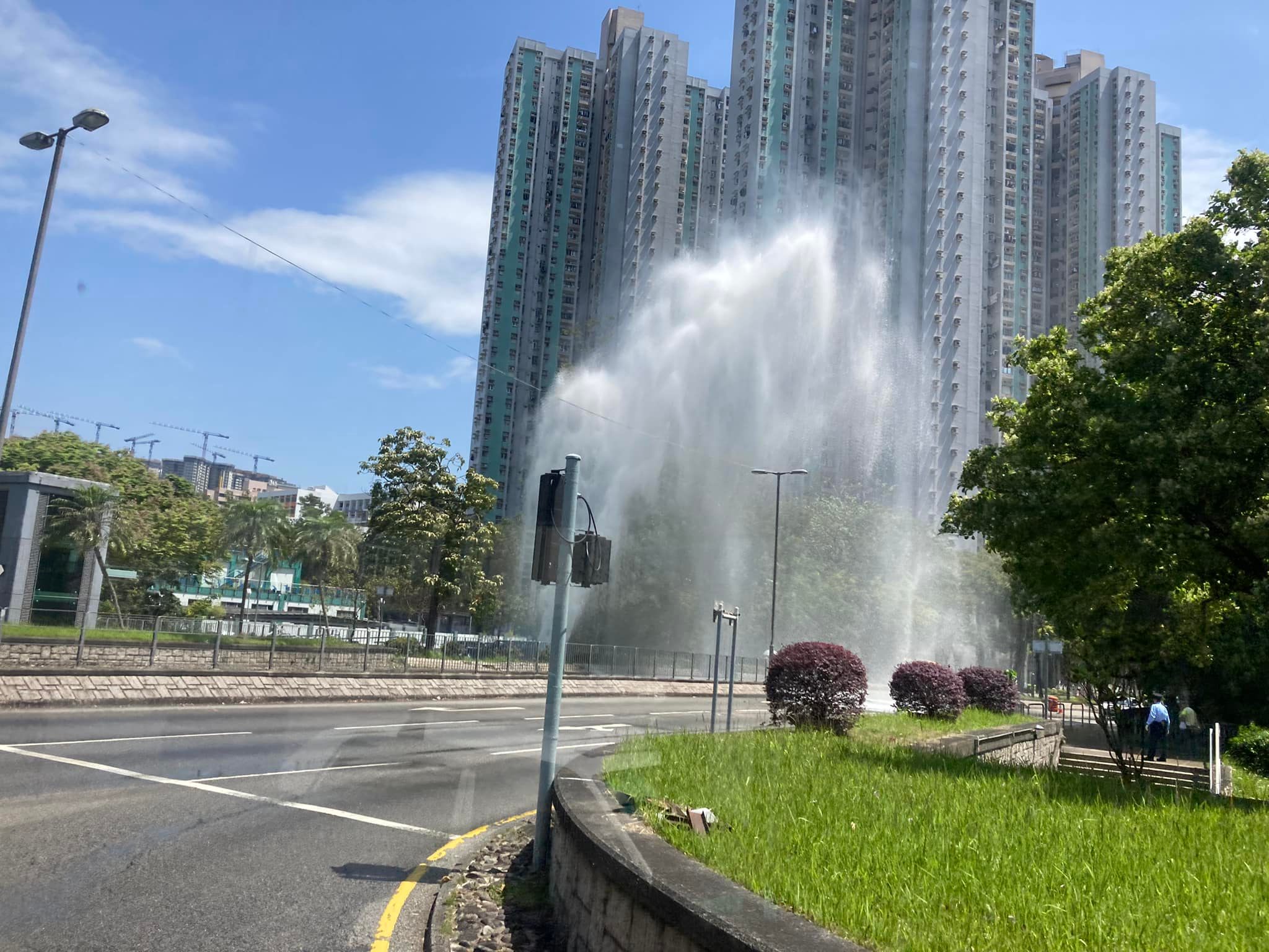 今日(5日)早上10時許,大埔安埔路怡雅苑對開地底一條食水管爆裂,水柱射出路面,高逾30米仿如巨型噴泉,水花四濺,並淹進附近一部行人天橋的升降機,影響毗鄰行車線,行經車輛需繞道而行,途人發現報警求助。