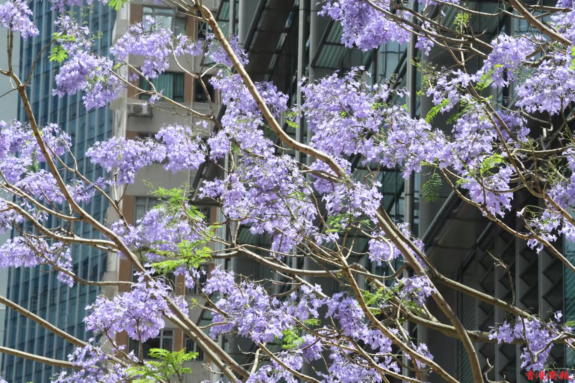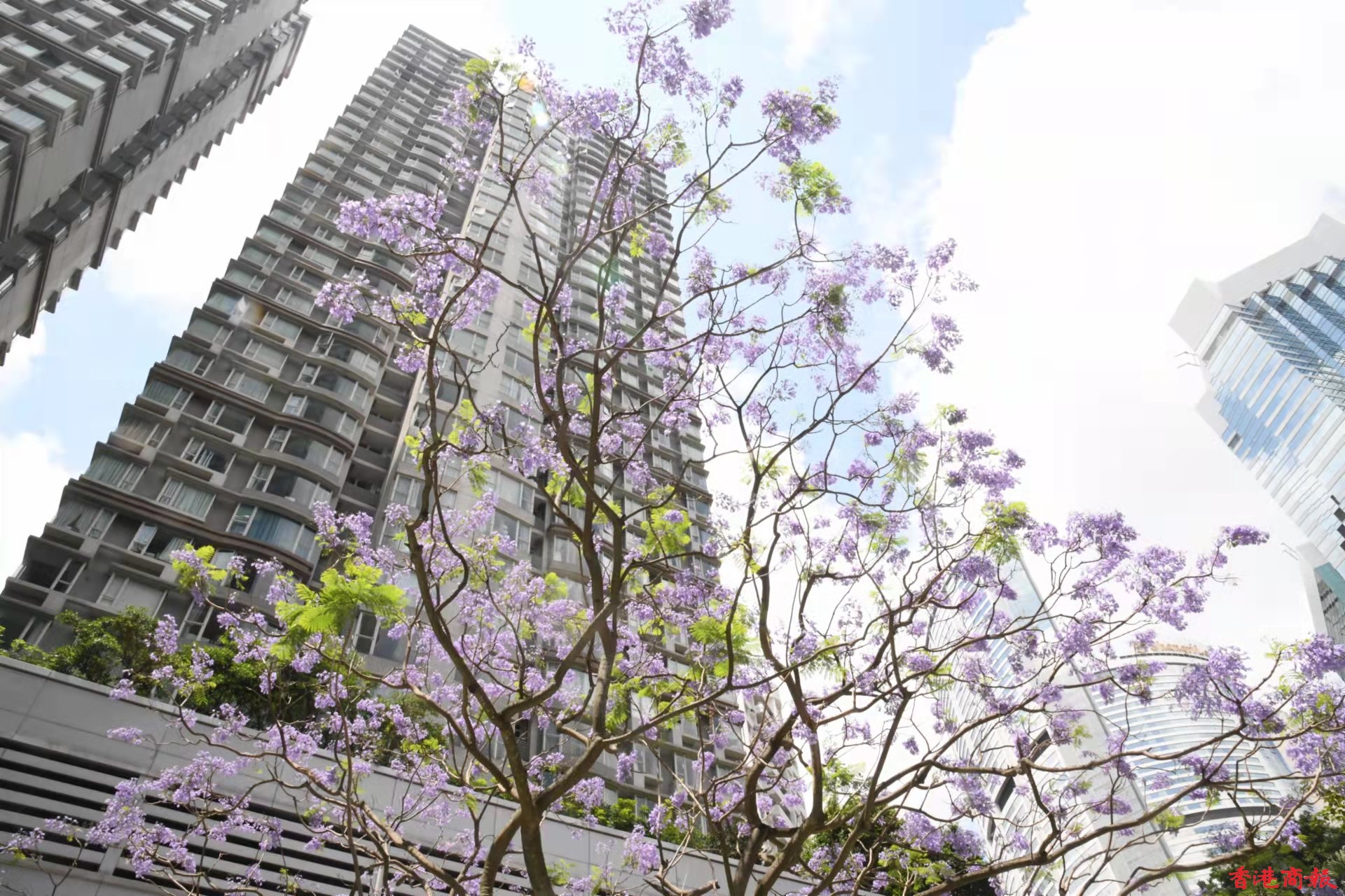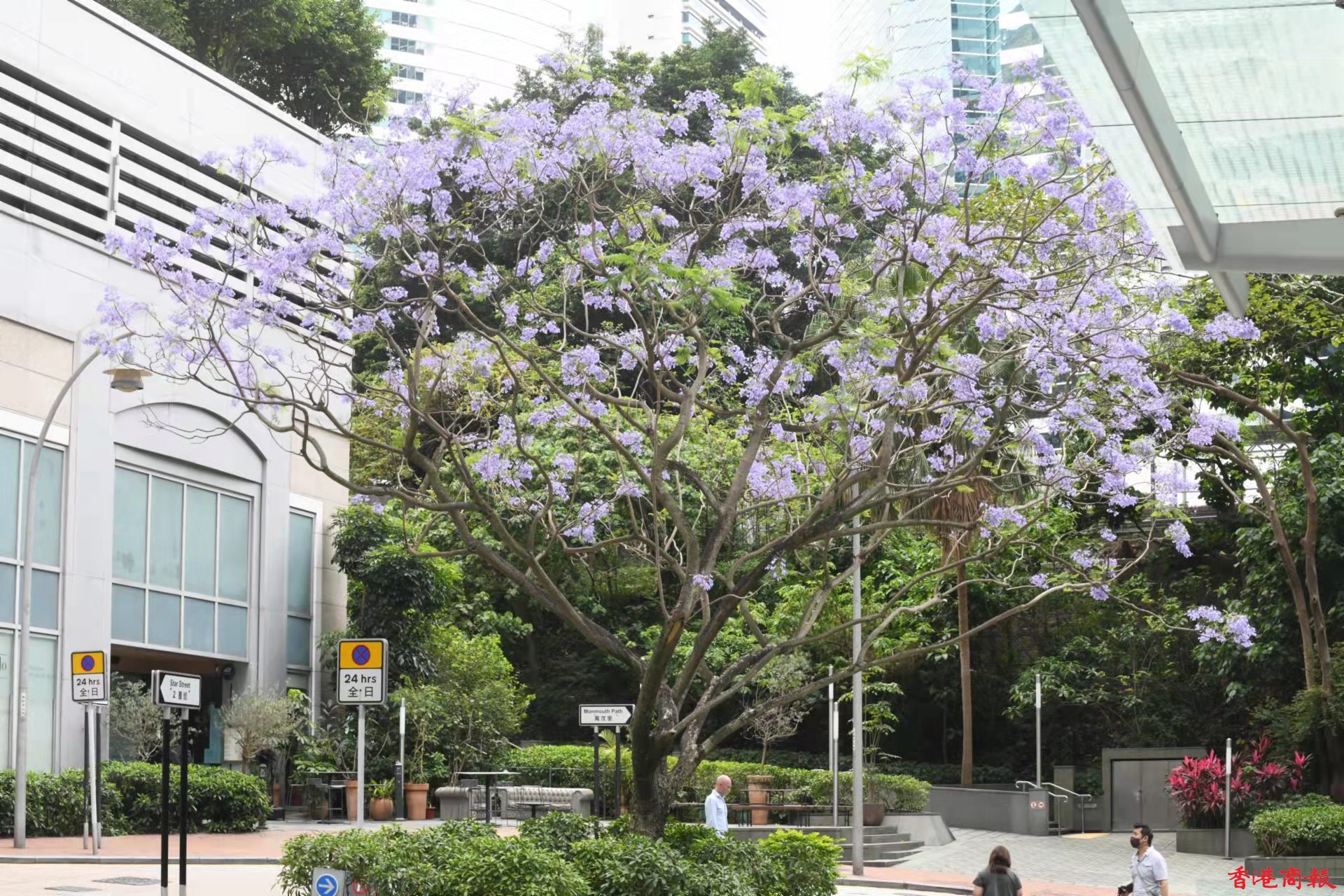 灣仔除了店舖林立,也是賞藍花楹的人氣地點。灣仔的一個小斜坡上,有一棵藍花楹,其枝節夠廣,開花時淡紫的花朵開得十分茂盛,與後面的大廈景色形成強烈對比,吸引不少人來賞花拍照。由於今年天氣較熱,藍花楹於三月底已經開花,而盛放期會在四月及五月。(蔡啟文攝)