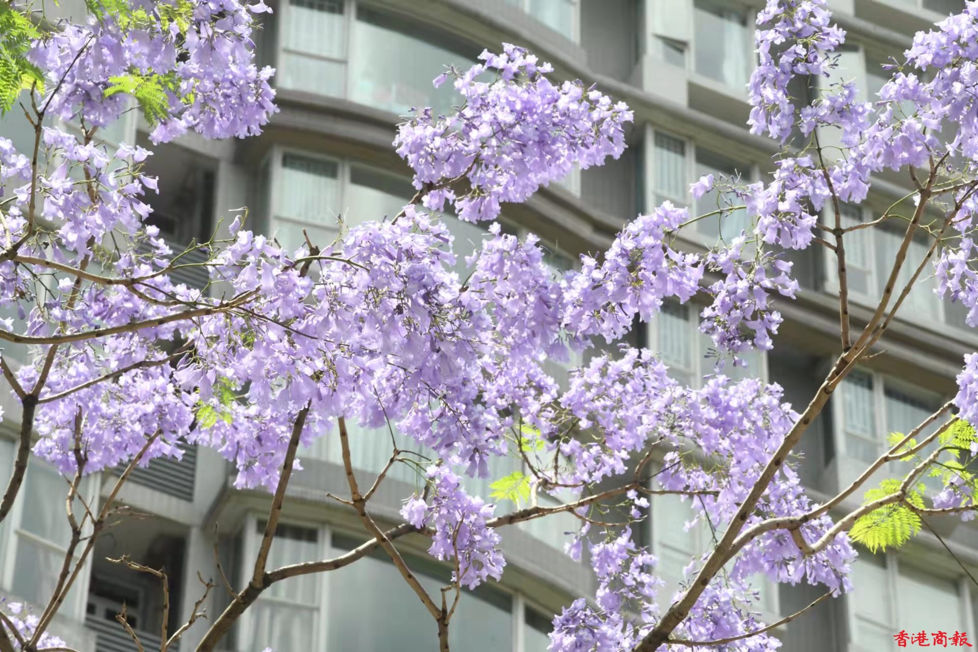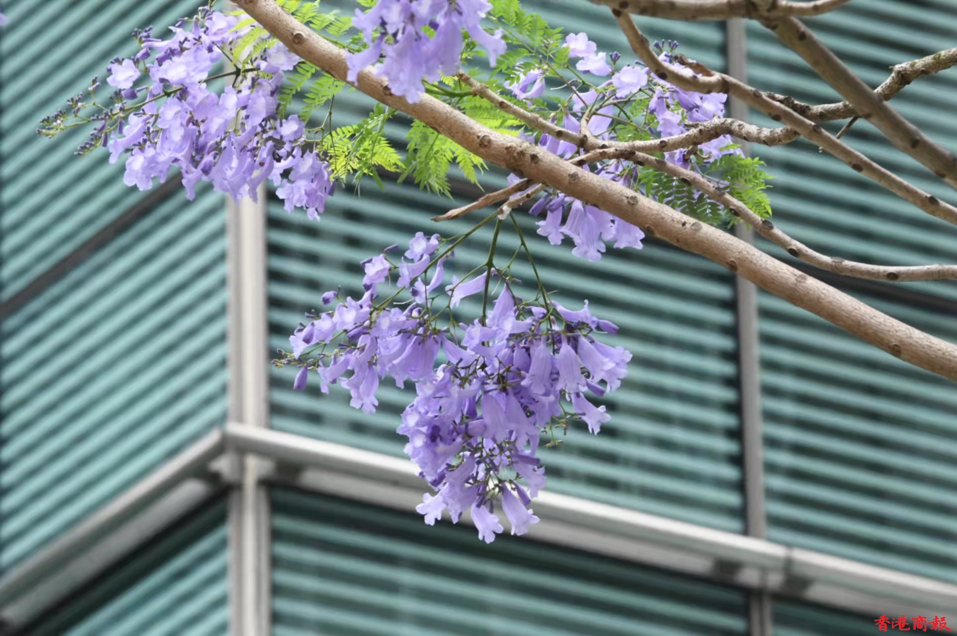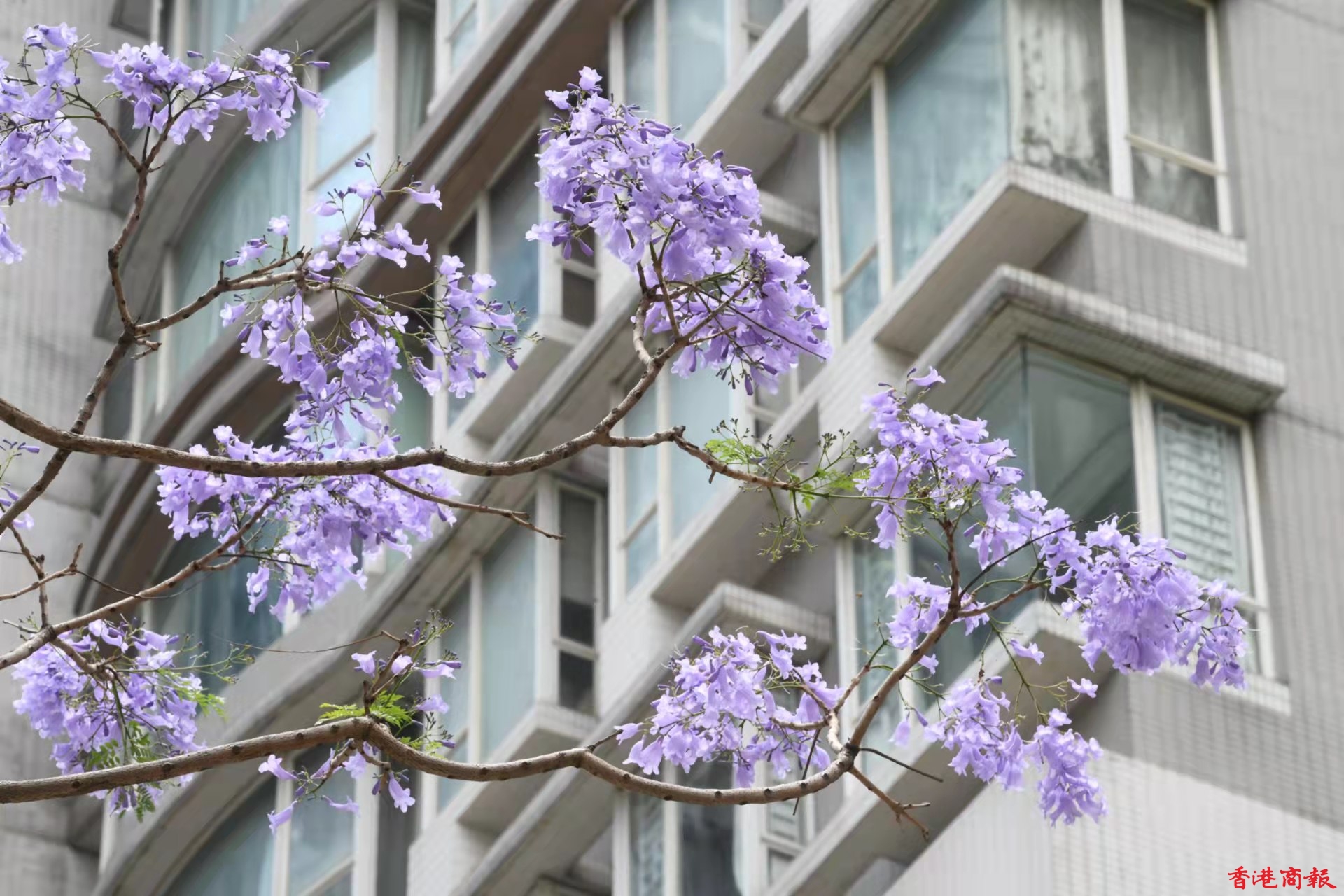灣仔除了店舖林立,也是賞藍花楹的人氣地點。灣仔的一個小斜坡上,有一棵藍花楹,其枝節夠廣,開花時淡紫的花朵開得十分茂盛,與後面的大廈景色形成強烈對比,吸引不少人來賞花拍照。由於今年天氣較熱,藍花楹於三月底已經開花,而盛放期會在四月及五月。(蔡啟文攝)