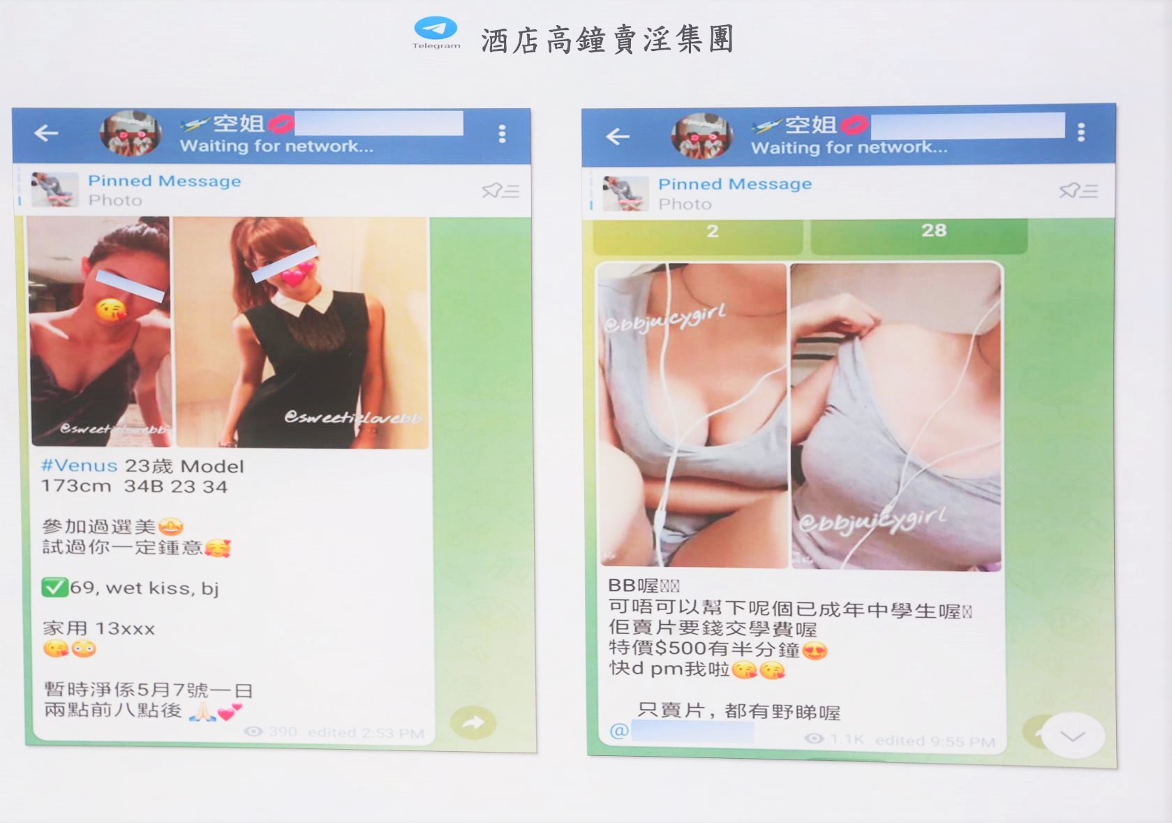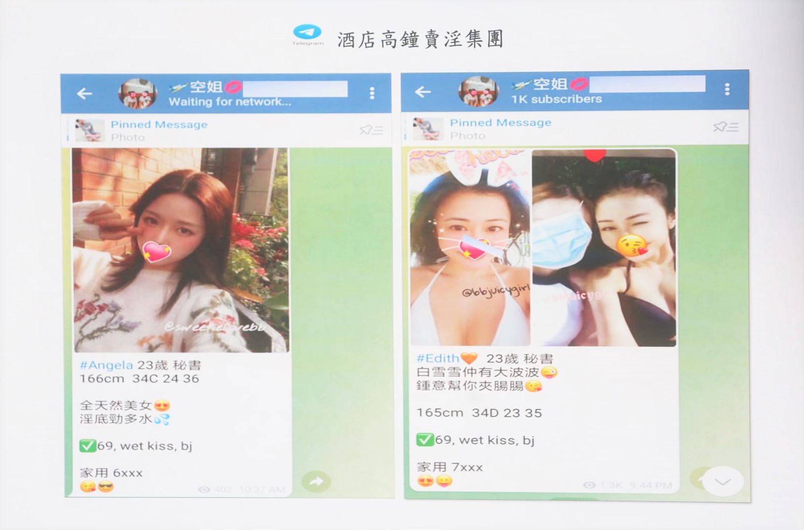 賣淫集團在Telegram頻道上的廣告。