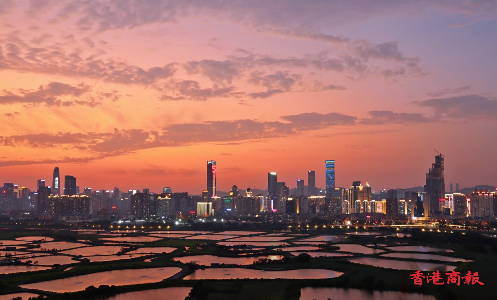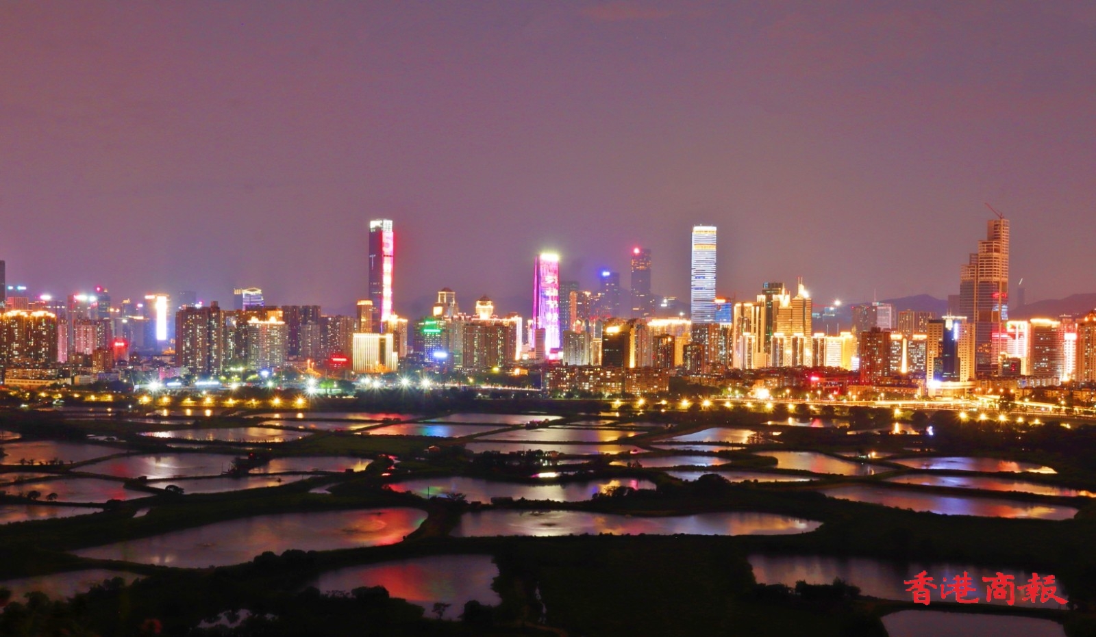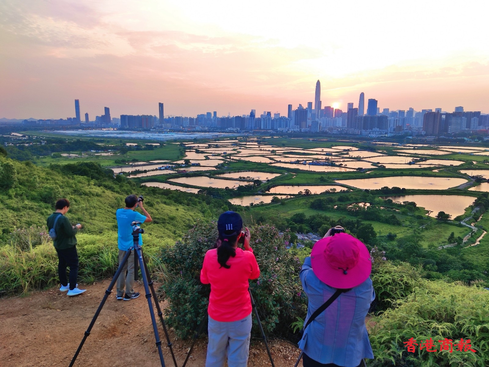 此外,在香港和深圳間的大片魚塘,每當日落黃昏時,魚塘的水面隨着時間的流逝,顏色由蔚藍,變成金黃,再轉化成幻紫, 尤如天神的調色盤,畫筆一揮,便繪出了醉人的落霞,配以深圳五光十色的現代商廈作背景,創造了攝影的好題材,也令行山人士着迷。(馮瀚文 攝)