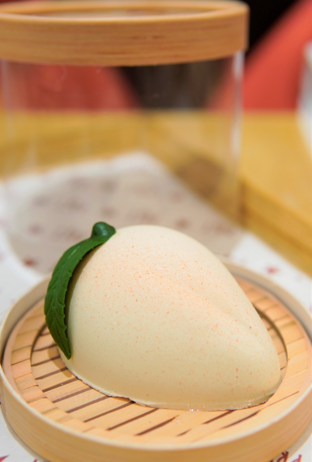 「熱情小壽桃蛋糕」,港幣48元。白色外皮為白朱古力,配合蒸籠造型的蛋糕盒,趣味盎然。
