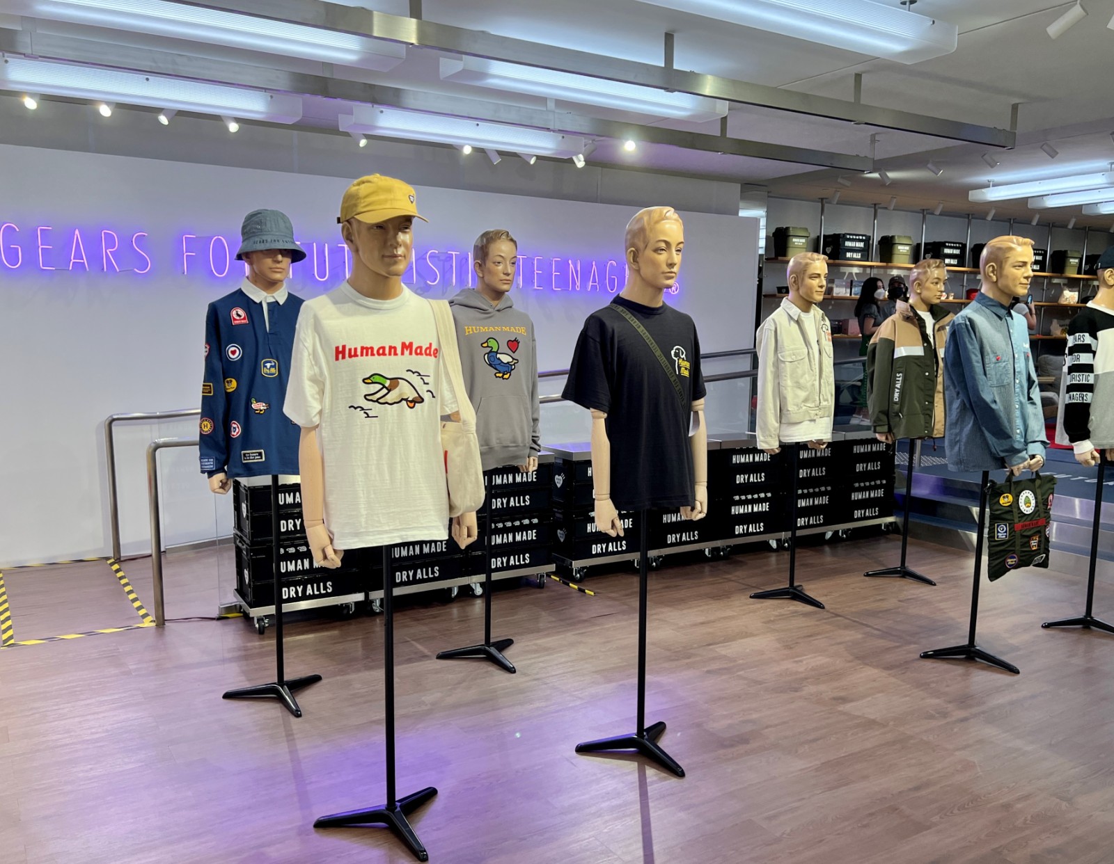 期間限定店佔地約2000 平方呎,甫踏進店內便看到燈箱及印有品牌標誌性紅色心形圖案的復古馬賽克地板,門口右邊在藍色心形圖案牆下則有紙漿造老虎頭掛飾,正面則還有一群穿着最新系列服飾的人型模特兒站立於霓虹燈箱前。另一邊廂的零售區則以帶有復古風的藍色為主調,加上中世紀風的躺椅和以HUMAN MADE貨箱製成的咖啡桌,打造成充滿品牌特色的休息區。