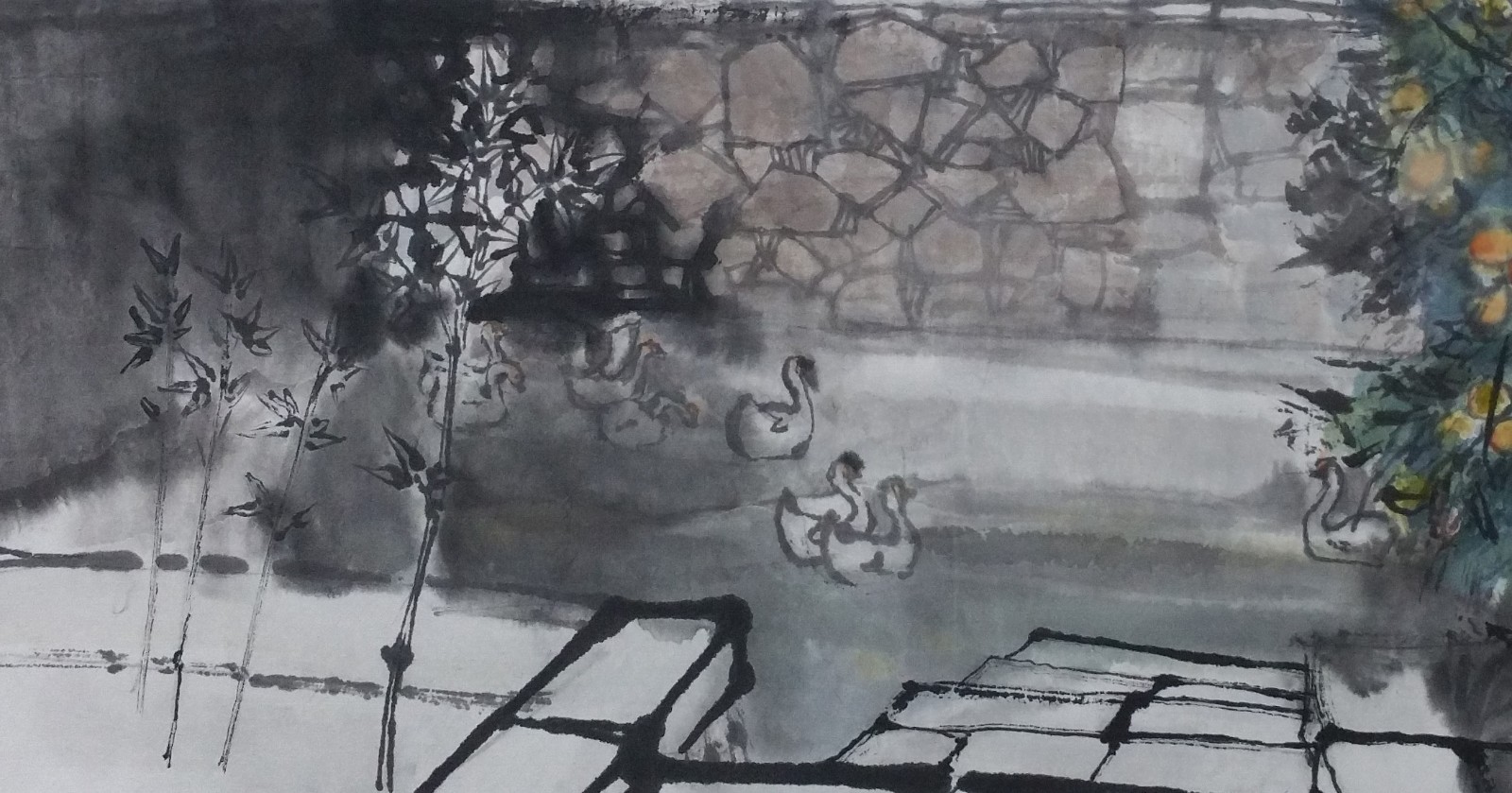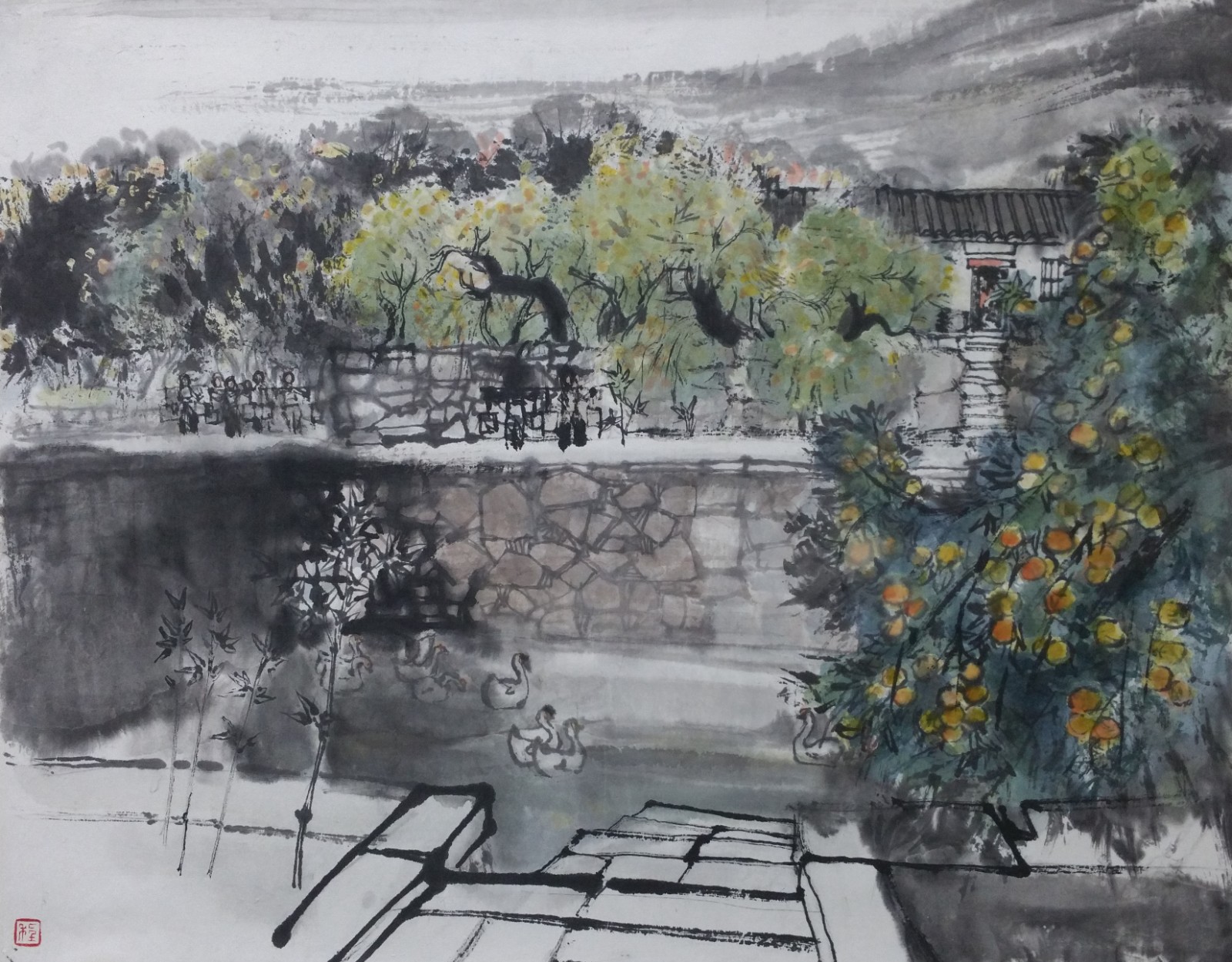 這幅畫以寫意手法表現了蘇州東山的一角,自然風景與生活情景和諧相融。房門貼著紅色的春聯,石板小徑順著坡勢向下蜿蜒到河邊,一群婦女正挑水回來,河裏游過一群鴨子,悠然自在。此情此景頗有「採菊東籬下,悠然見南山」般的田園詩意,表達了畫家對自然的美好嚮往和對寧靜生活的讚頌。