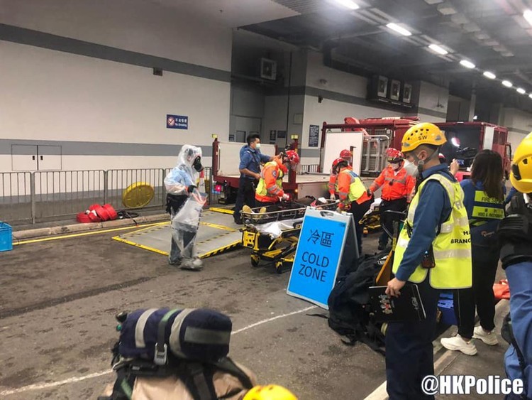 警務處聯同消防處10日凌晨在香港會議展覽中心二期進行跨部門化生輻核反恐演習,以加強各部門在大型行動中的協調合作,以及在事故中的應變能力。(香港警察FACEBOOK專頁圖片)