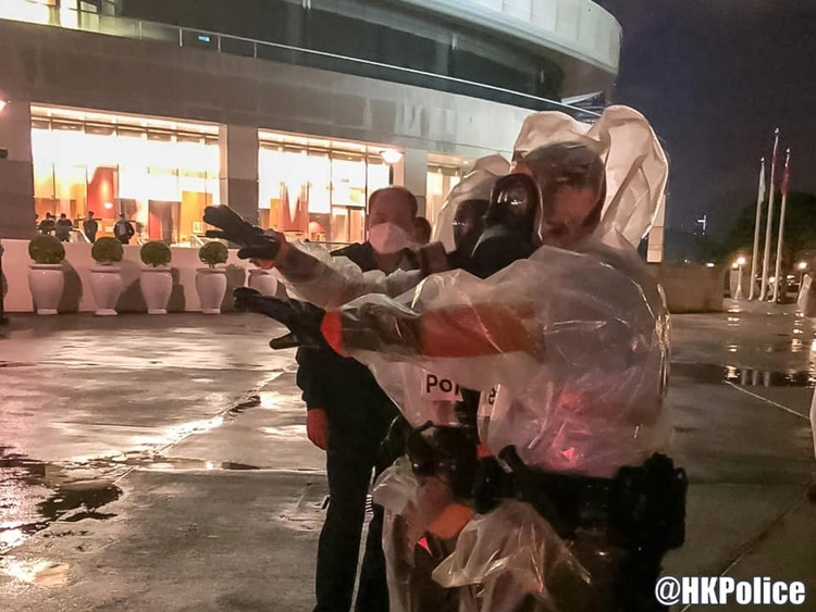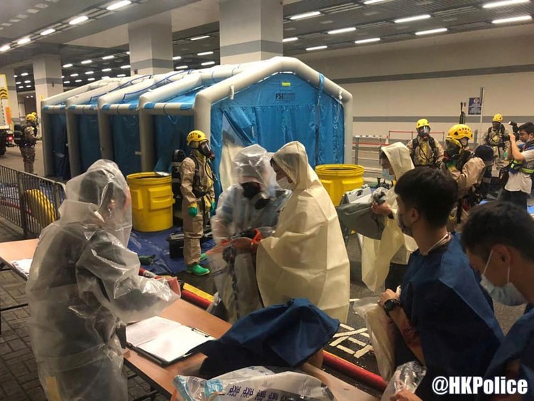 警方晚上在社交媒體表示,演習模擬於香港會議展覽中心二期舉辦慶祝香港特別行政區成立25周年文藝晚會期間,會場受到化生輻核襲擊,導致多人受傷及受感染。參與單位包括港島總區衝鋒隊、灣仔分區、消防處港島總區和危害物質專隊。