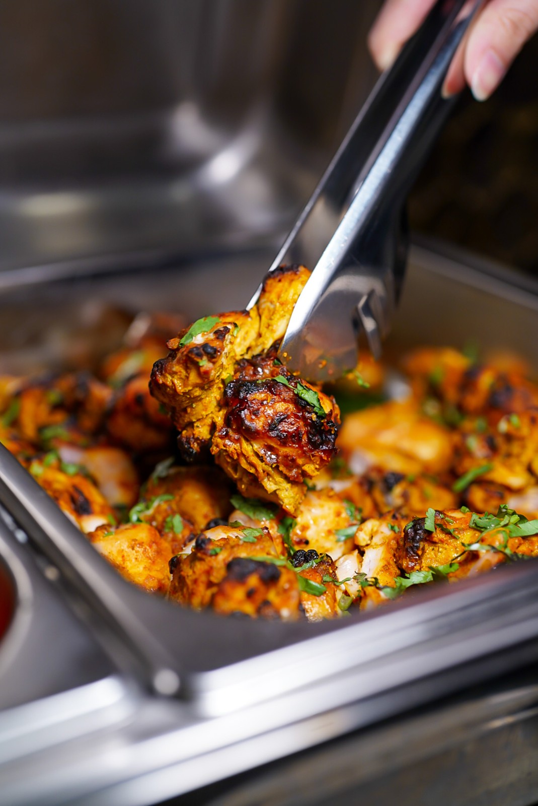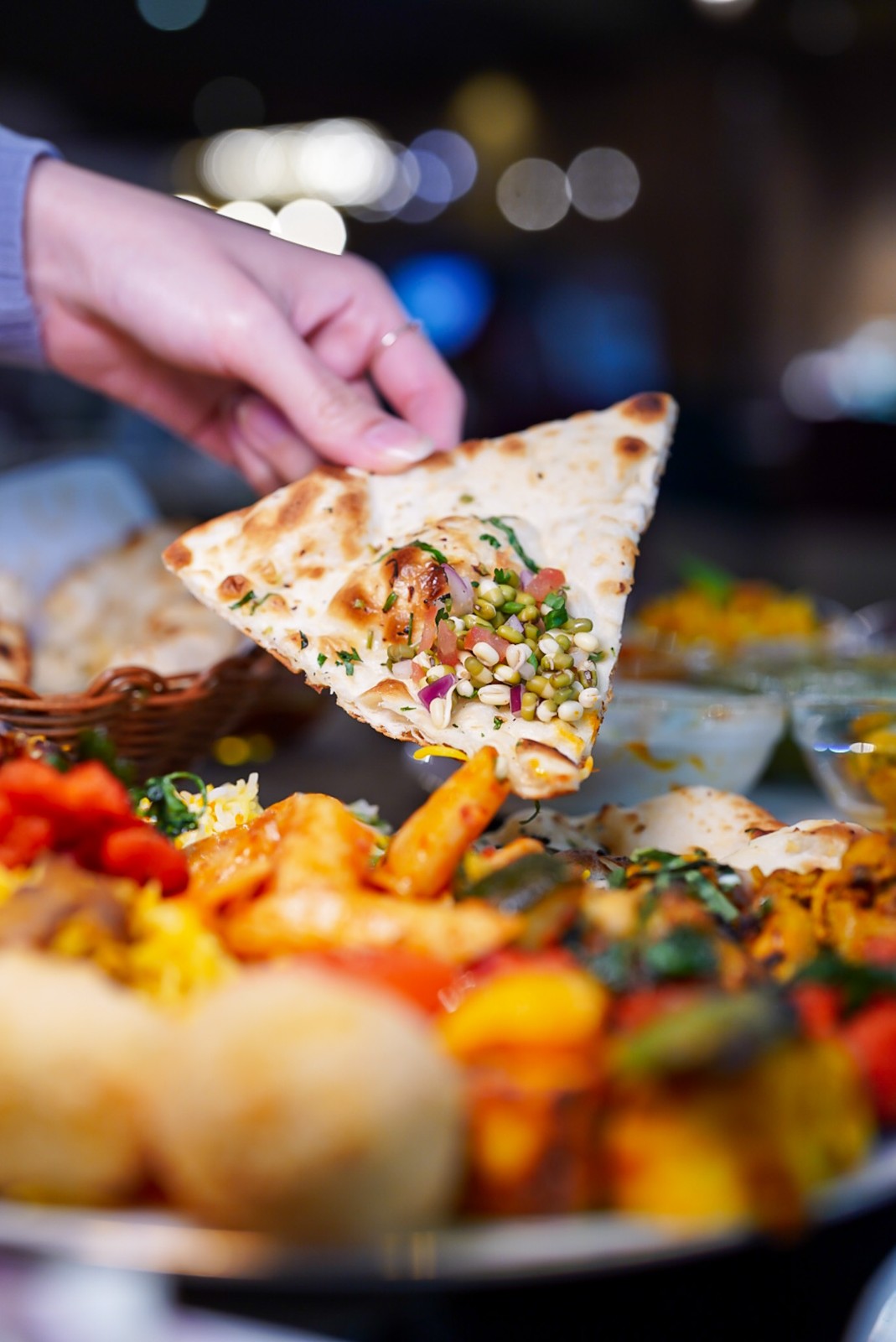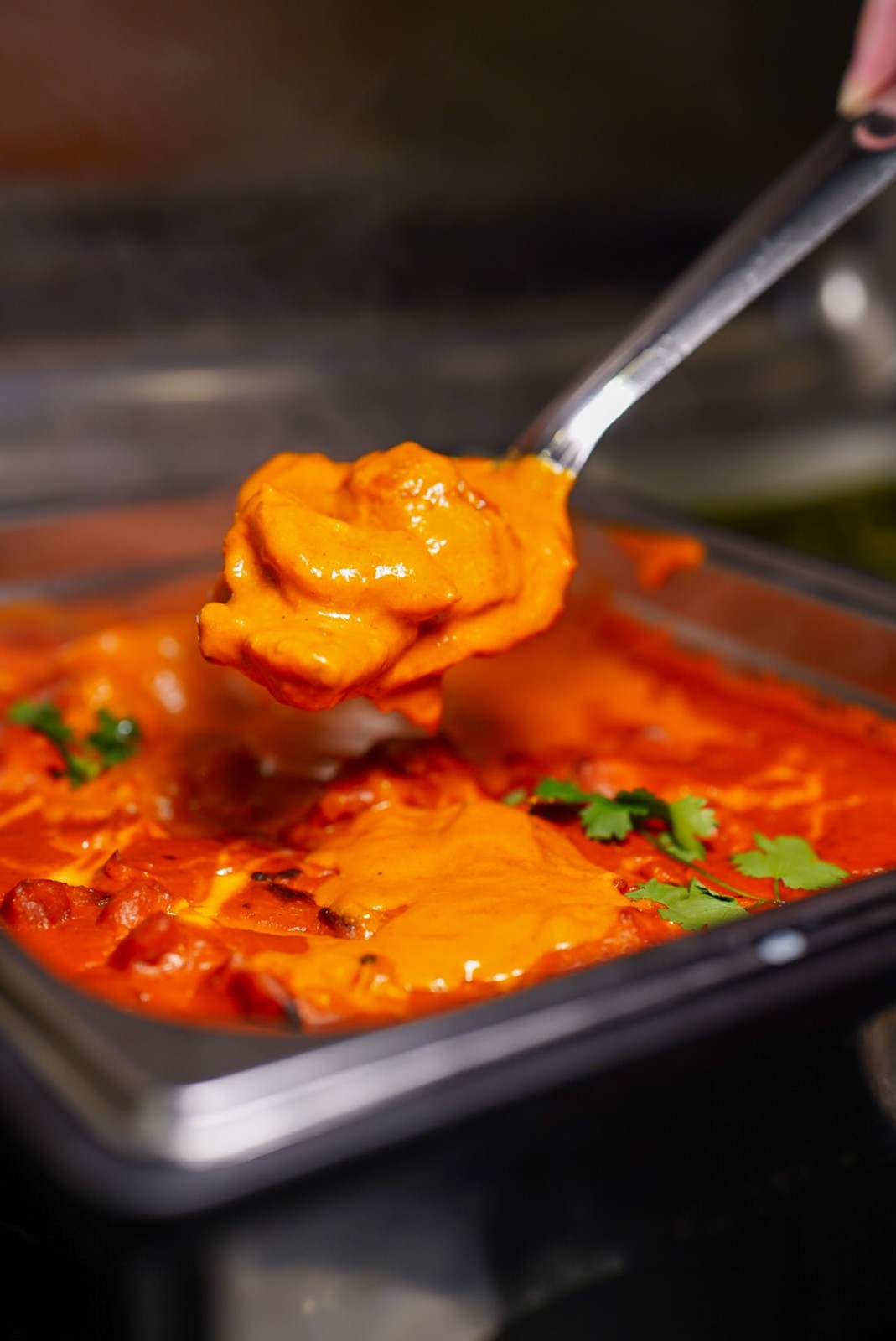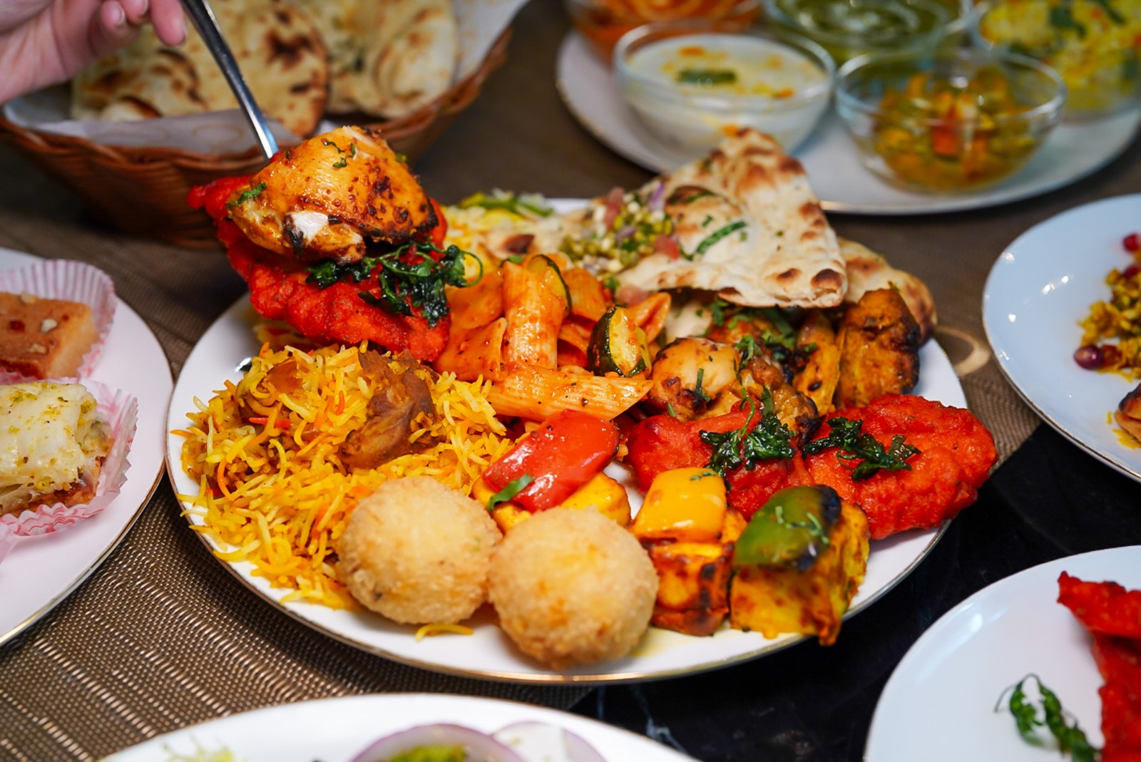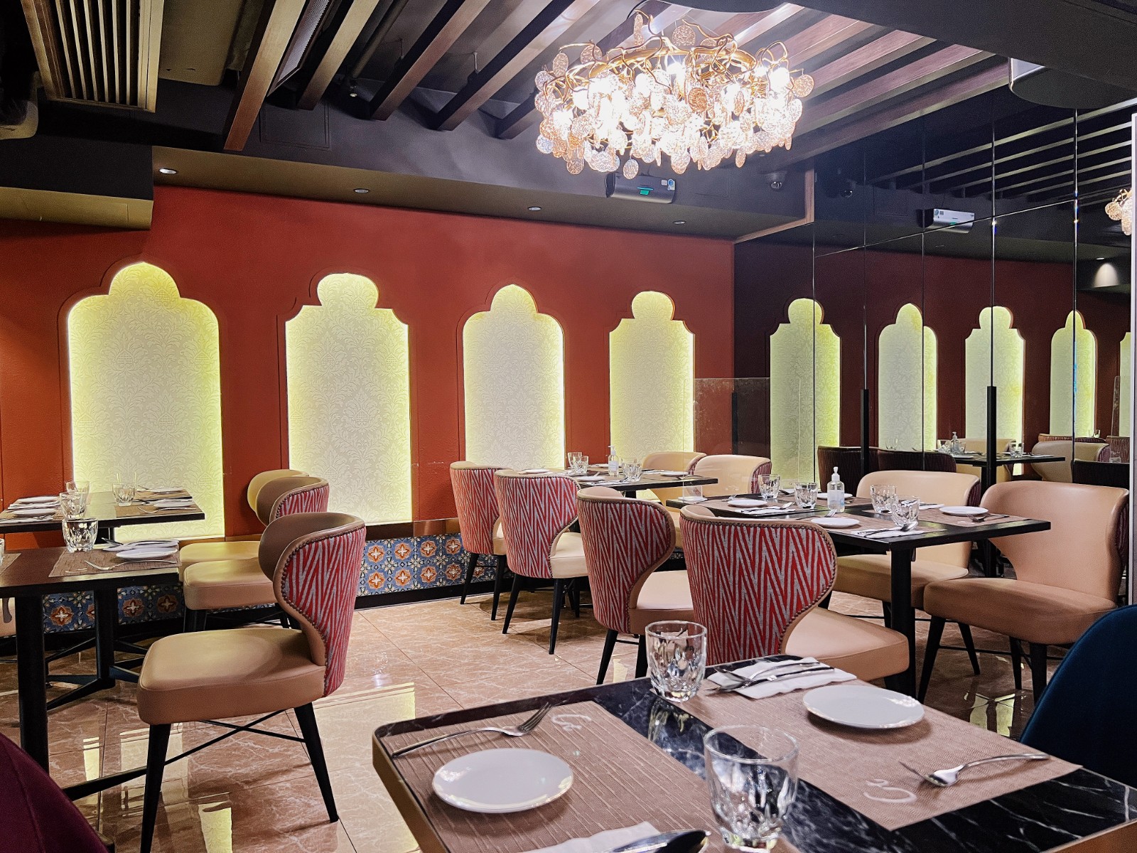 餐廳菜式由曾任職孟買君悅酒店的印度大廚Ratan Singh主理,以秘方調製20多款香料,搭配印度常用食材,烹調出各式各樣的頭盤小吃。如種類繁多、不同香料交織的咖喱,包括口感豐富的黑扁豆咖喱,混合了乾燥和新鮮的香料和香草,略帶煙熏味,印度奶醬咖喱芝士的奶油濃度適中,含洋蔥、番茄、腰果和香料,味道層次豐富。自助餐還有天多利爐烤製的燒肉、芝士、印度烤餅,烤餅外脆內軟,口感紮實有嚼勁,混著咖喱配搭印式海鮮、燒魚、烤雞,讓人胃口大開。不喜歡烤餅,則可選擇印度香飯,印度米呈長瘦形,粒粒分明的米飯讓各式咖喱、醬汁更均勻包裹。