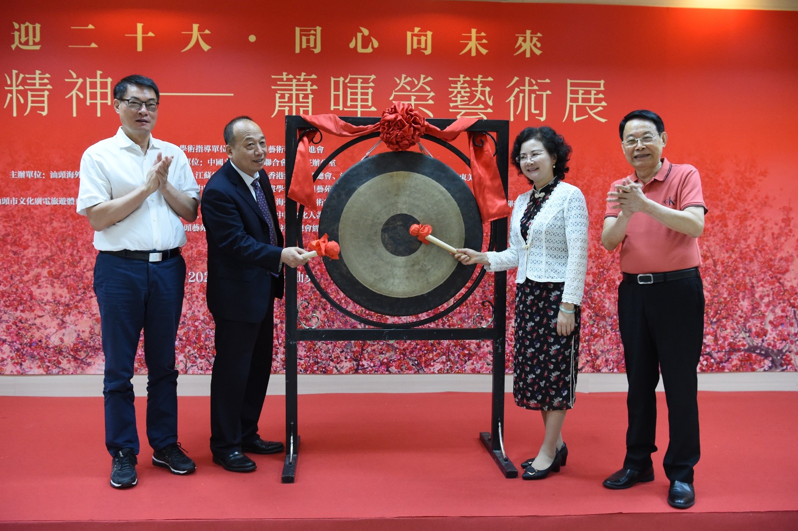 蕭暉榮(右一)、中國文聯港澳台辦公室主任董占順(左二)、廣東省文聯黨組書記王曉(右二)、汕頭市政協第十三屆主席謝澤生(左一)為畫展鳴鑼揭幕。