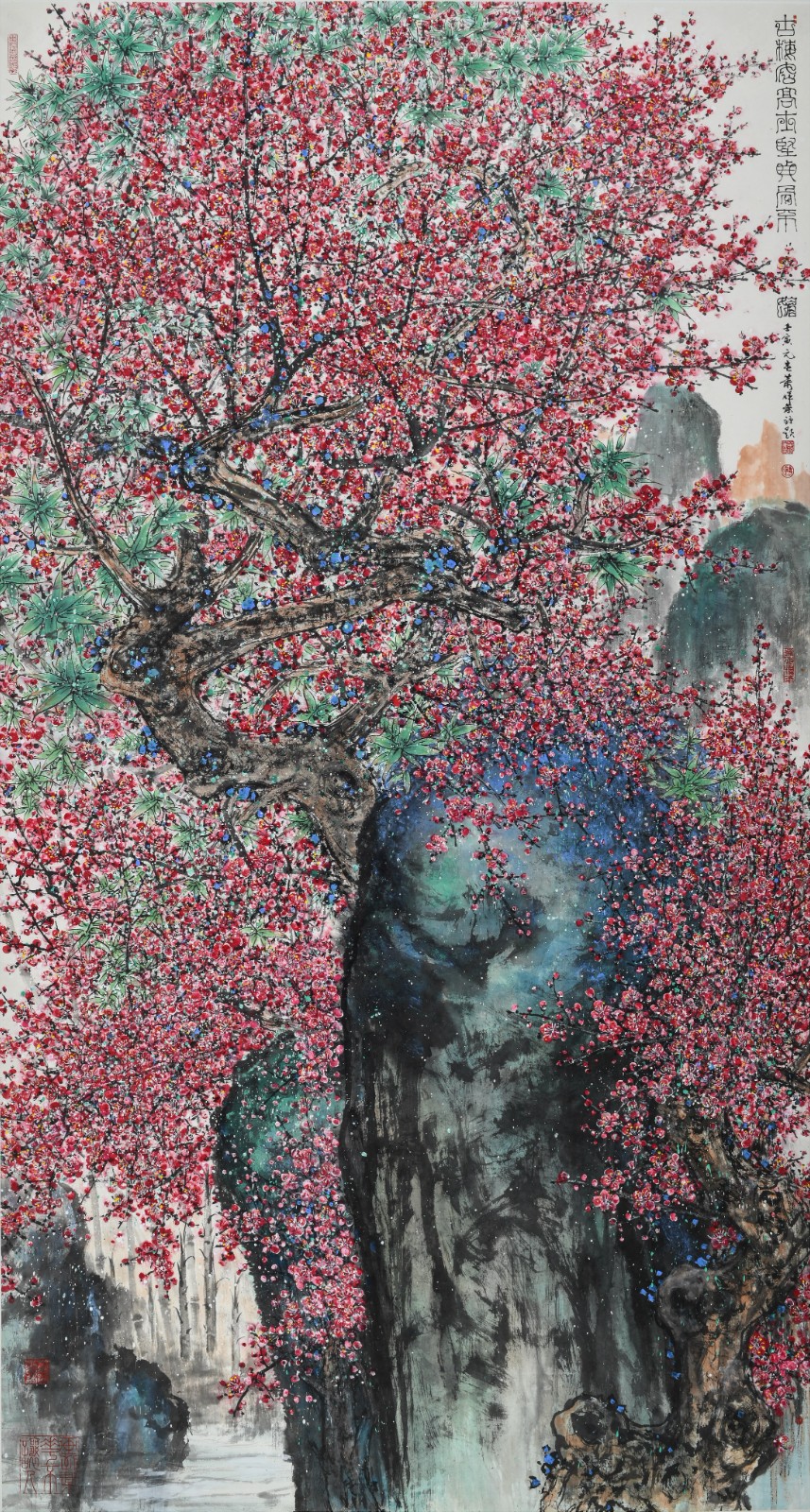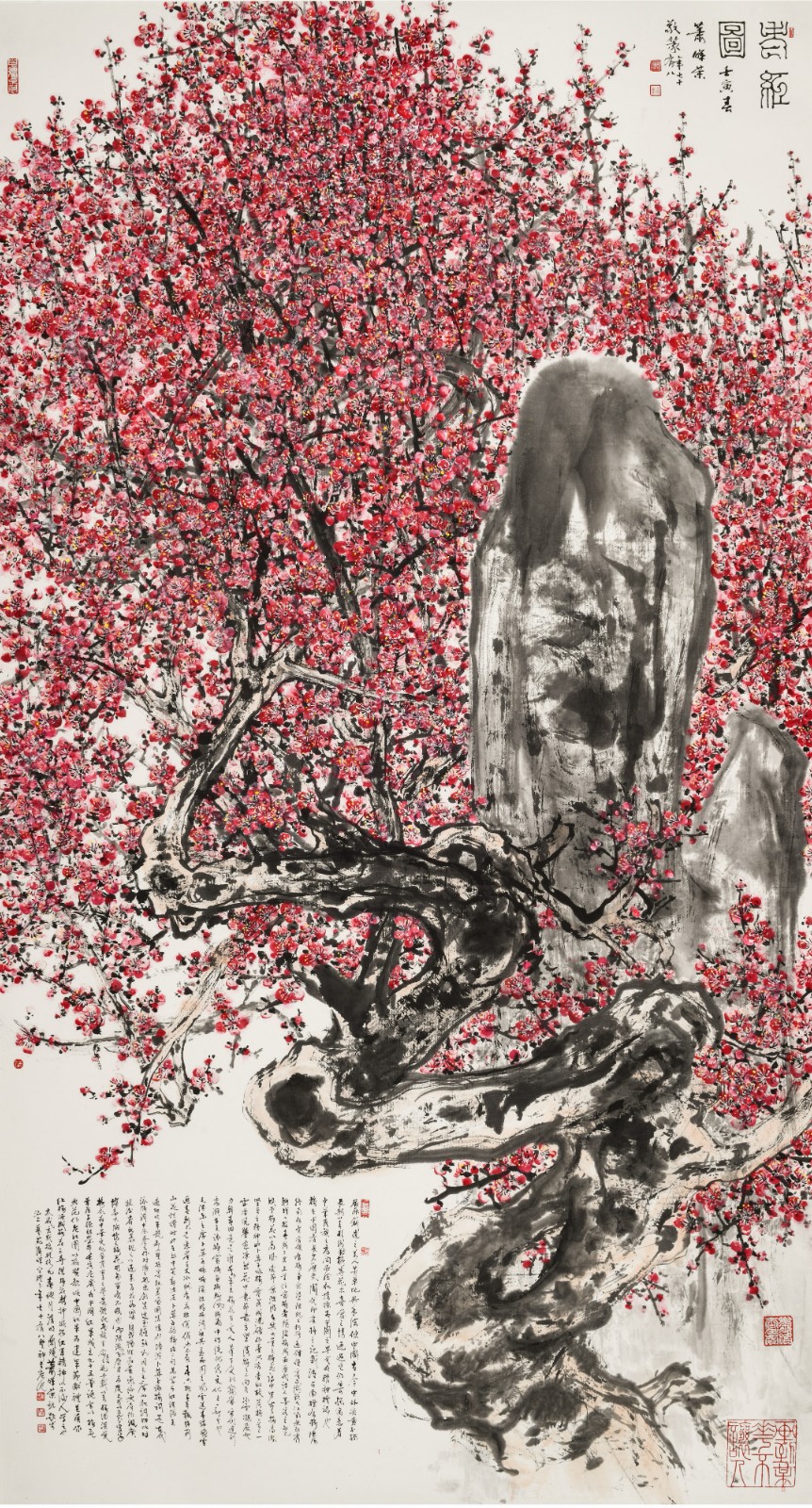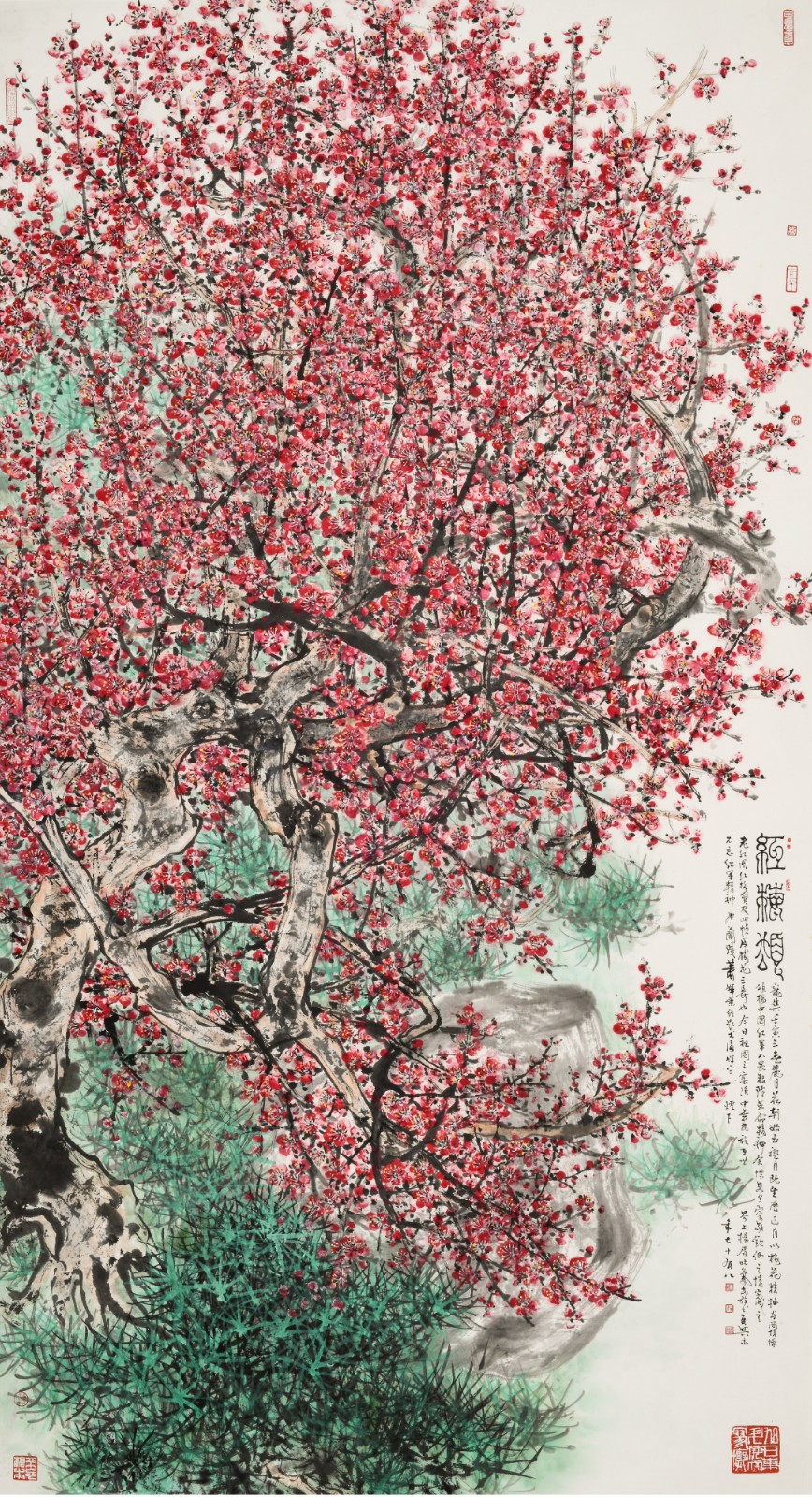 蕭暉榮作品《梅花三弄之紅梅頌》, 設色紙本,153x83cm,2022年。