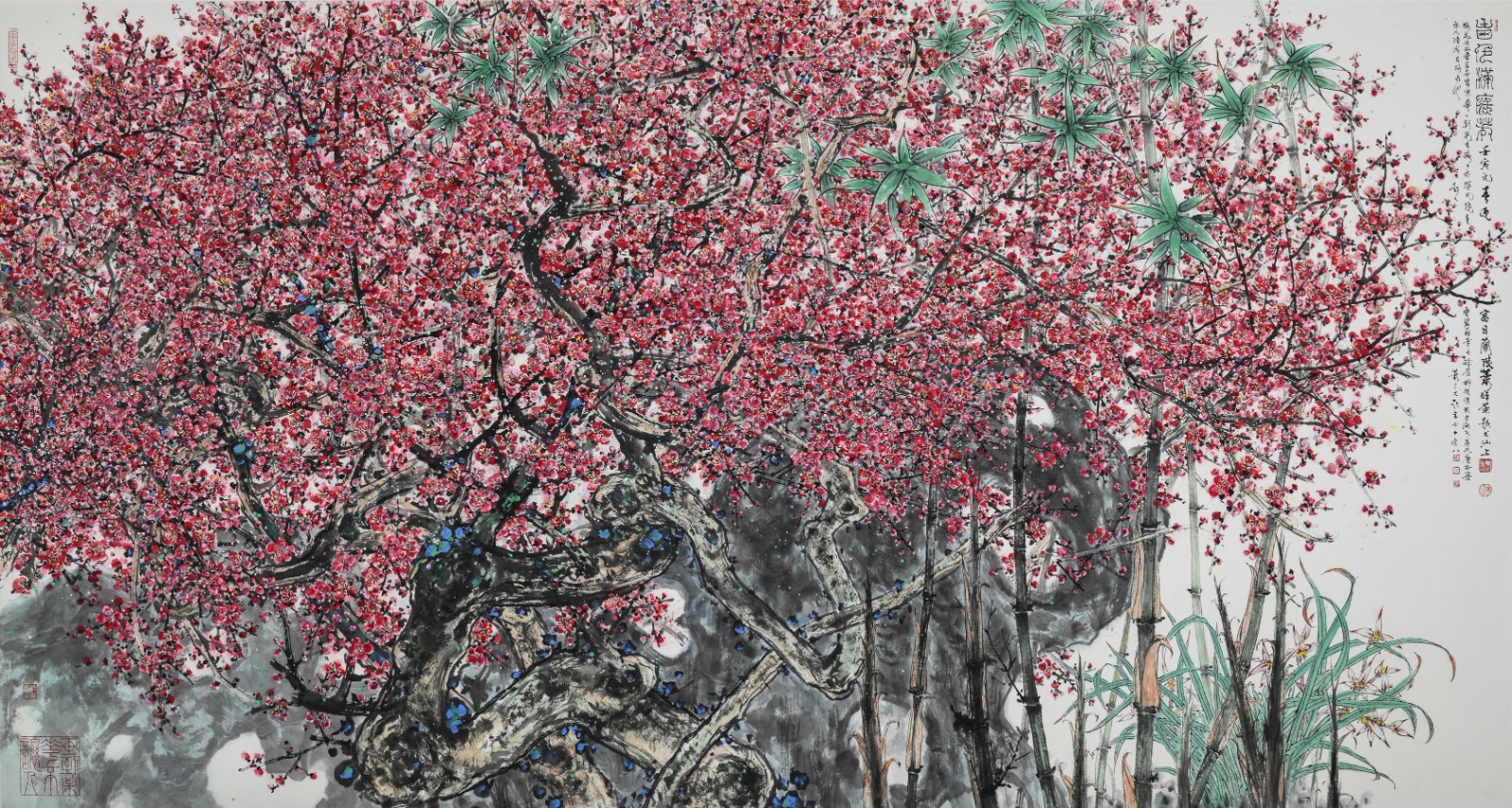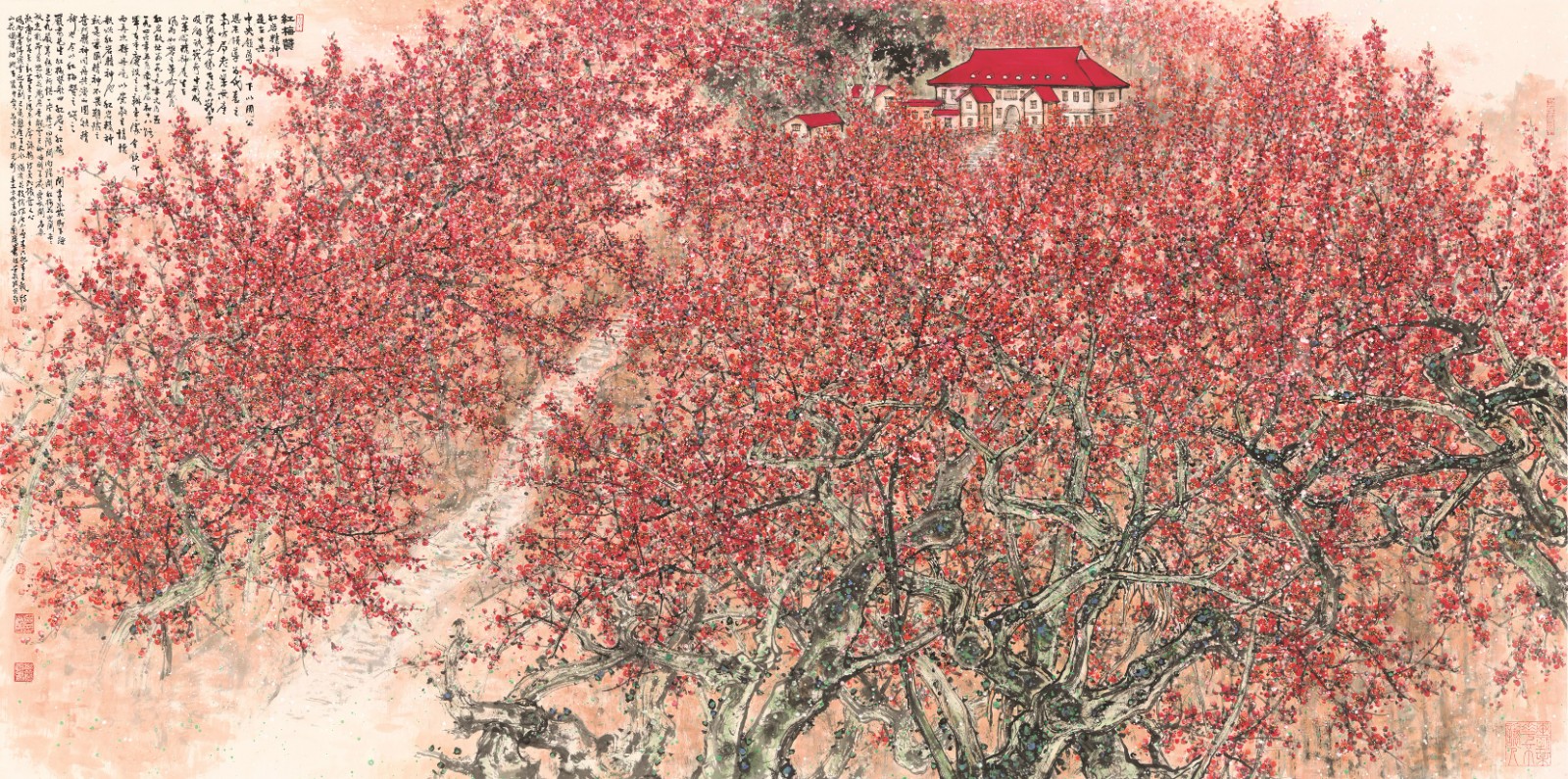 蕭暉榮作品《紅梅贊·紅岩精神》,設色紙本,124x247cm, 2021年。