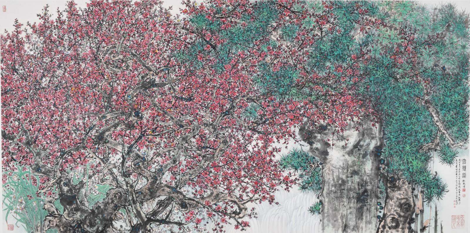 蕭暉榮作品《松梅頌》,設色紙本,123x248cm,2021年。
