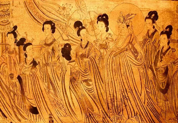 有「畫聖」之尊的吳道子所畫的觀音像,就被武則天陪葬了。傳說吳道子當年在朝廷作畫師的時候經常在外邊採風。有一次採風歸來,每一個畫師都作了一幅山水圖,唯獨吳道子什麼都記不起來,只記得夢境中出現的觀音菩薩,於是入畫。武則天欣賞之後大悅。有傳說武則天與這幅畫裡的觀音非常相似。