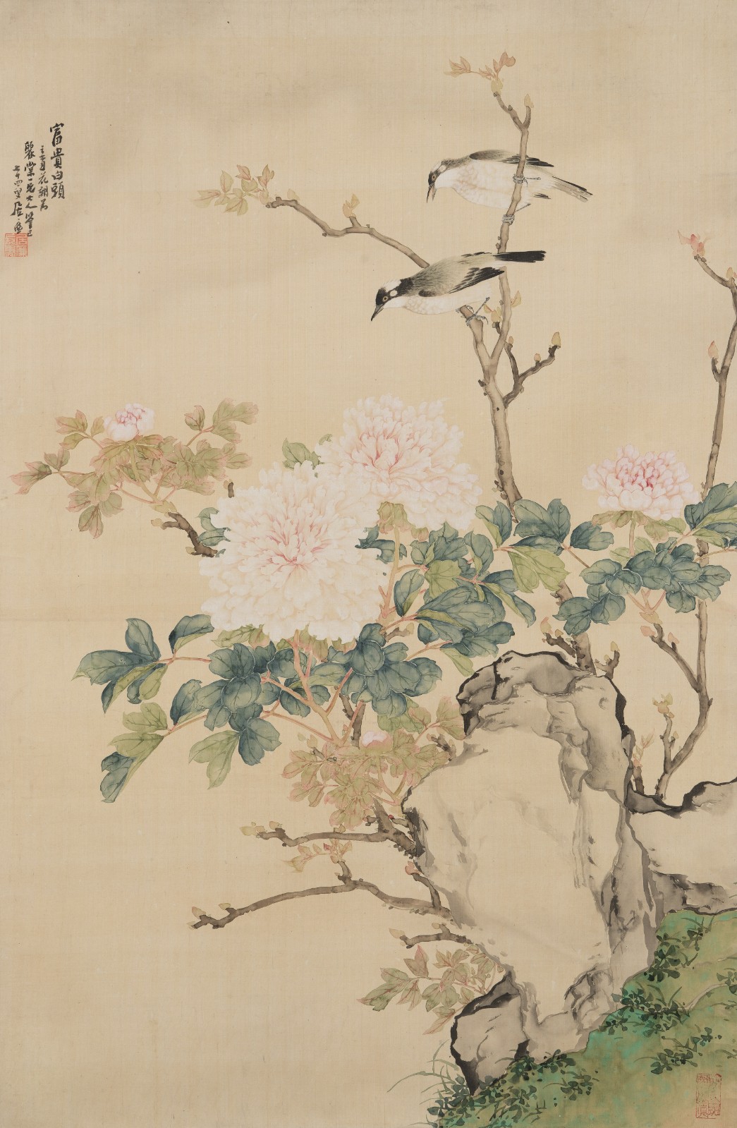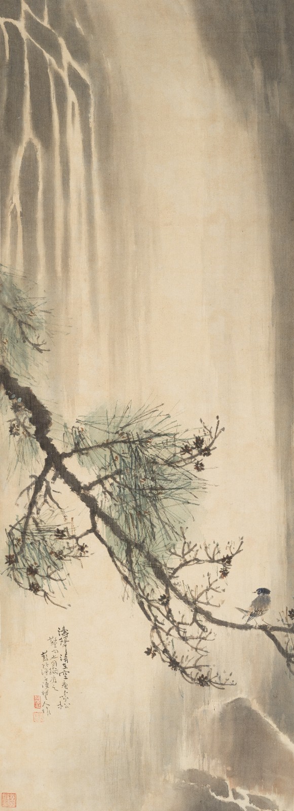 與高劍父、高奇峰共同開創新國畫的陳樹人,是十香園居廉的關門弟子,他的妻子居若文是居巢的孫女,「二高一陳」與居派關係密切。展品《瀑布古松》,陳樹人藉着描寫由上而下衝力極大的瀑布,與畫面前方佇立在松枝上的鳥兒,形成動與靜的對比,表達「濤聲清在空」的意境。
