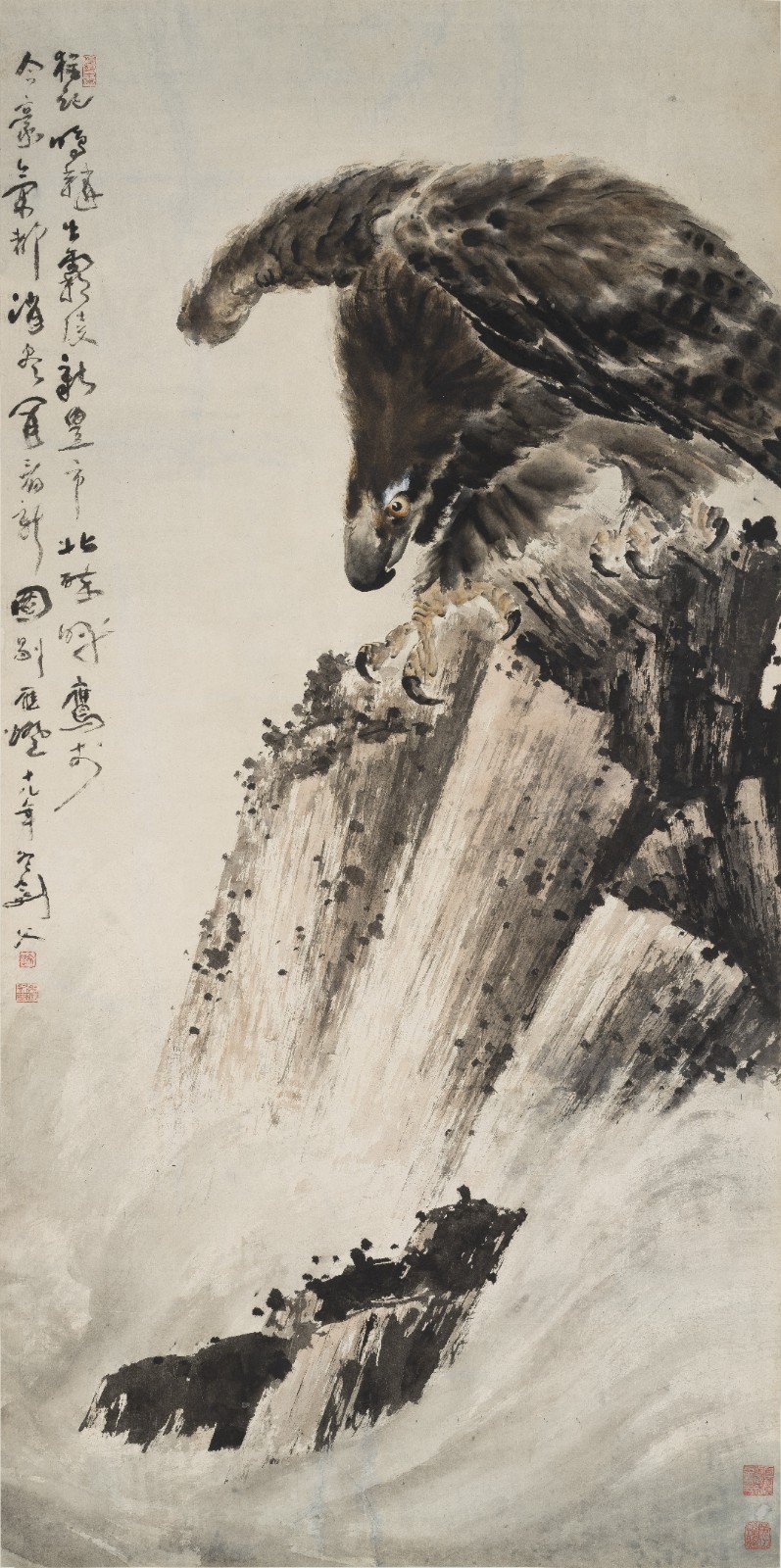 此外,高劍父擅於捕捉物象的氣勢與神韻,展品《大鷹》靈感來自太田文暉的《巖鷲》,高劍父以詩引領觀眾進入他的內心世界,「於今豪氣都消盡」,感慨當年如大鷹般的豪情已不復再,只能把激情釋放在畫作中。大鷹的眼睛以西洋點白法描繪,炯炯有神。羽毛的渲染與堅硬山石的乾筆大斧劈皴對比強烈,令畫面充滿張力。