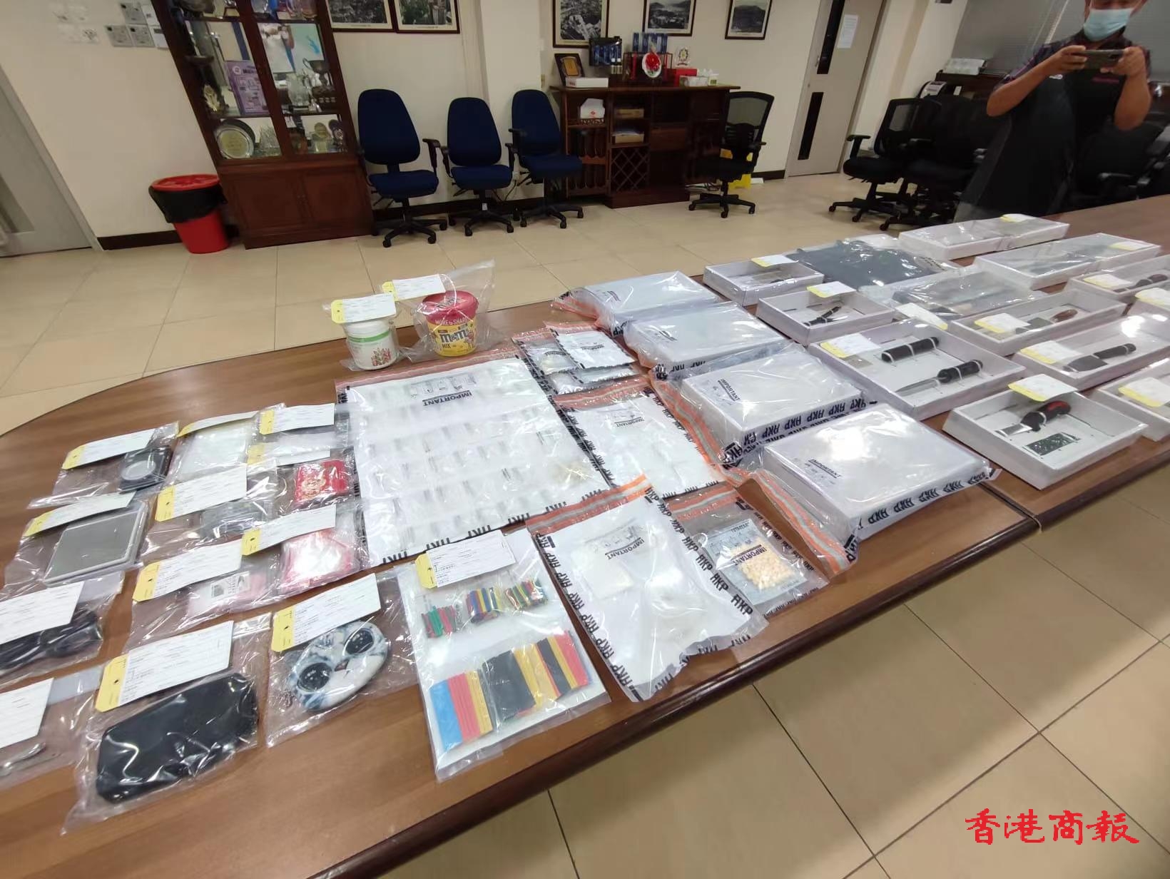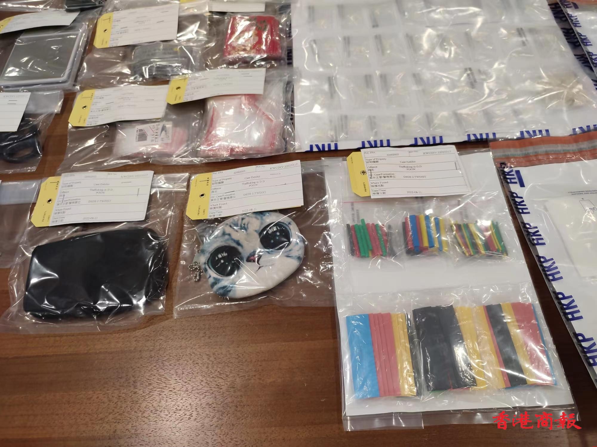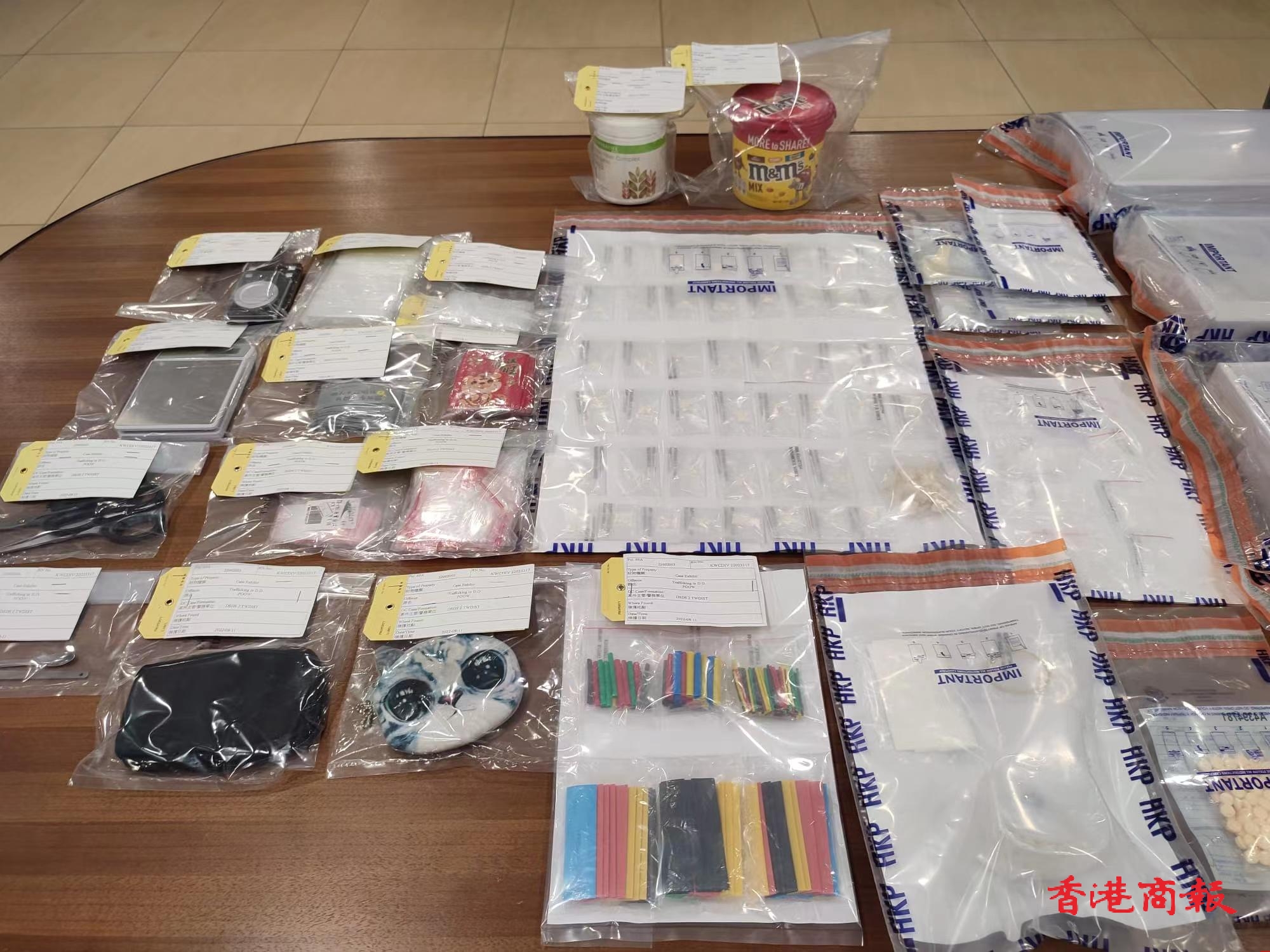 荃灣特別職務隊第二隊人員調查後,於昨日(11日)凌晨展開反毒品行動,突擊搜查涉案公屋單位,搜出70克霹靂可卡因、60克冰毒、145粒搖頭丸和少量大麻,另有大量毒品包裝和吸食工具,毒品總值約15萬元。 此外,在單位內亦搜出開山刀、蝴蝶刀、軍刀和伸縮棍等武器。