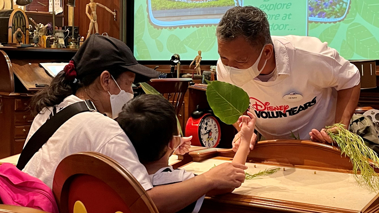 香港迪士尼安排園藝部演藝人員擔任導賞員,首先在活動教室內讓小朋友接觸樹葉、花朵等植物樣本,初步認識植物的構造。