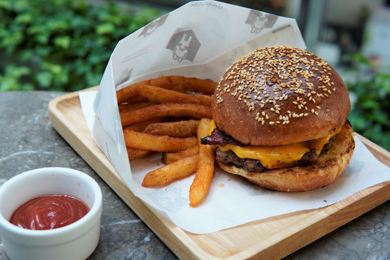 車打芝士煙肉牛肉漢堡伴香辣薯條,HK$68。(此配搭僅限下午茶時段供應)