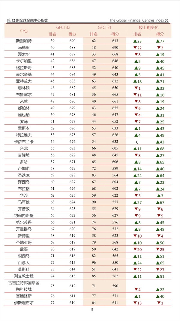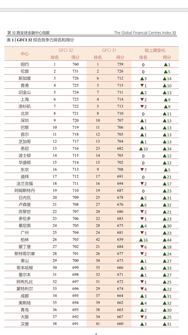32)」。該指數從營商環境、人力資本、基礎設施、金融業發展水平、聲譽等方面對全球主要金融中心進行了評價和排名。第32期GFCI共有119個金融中心進入榜單,在全球前十大金融中心排名中,香港位列第四,深圳位列第九。全球前十大金融中心排名依次為:紐約、倫敦、新加坡、香港、三藩市、上海、洛杉磯、北京、深圳、巴黎。
