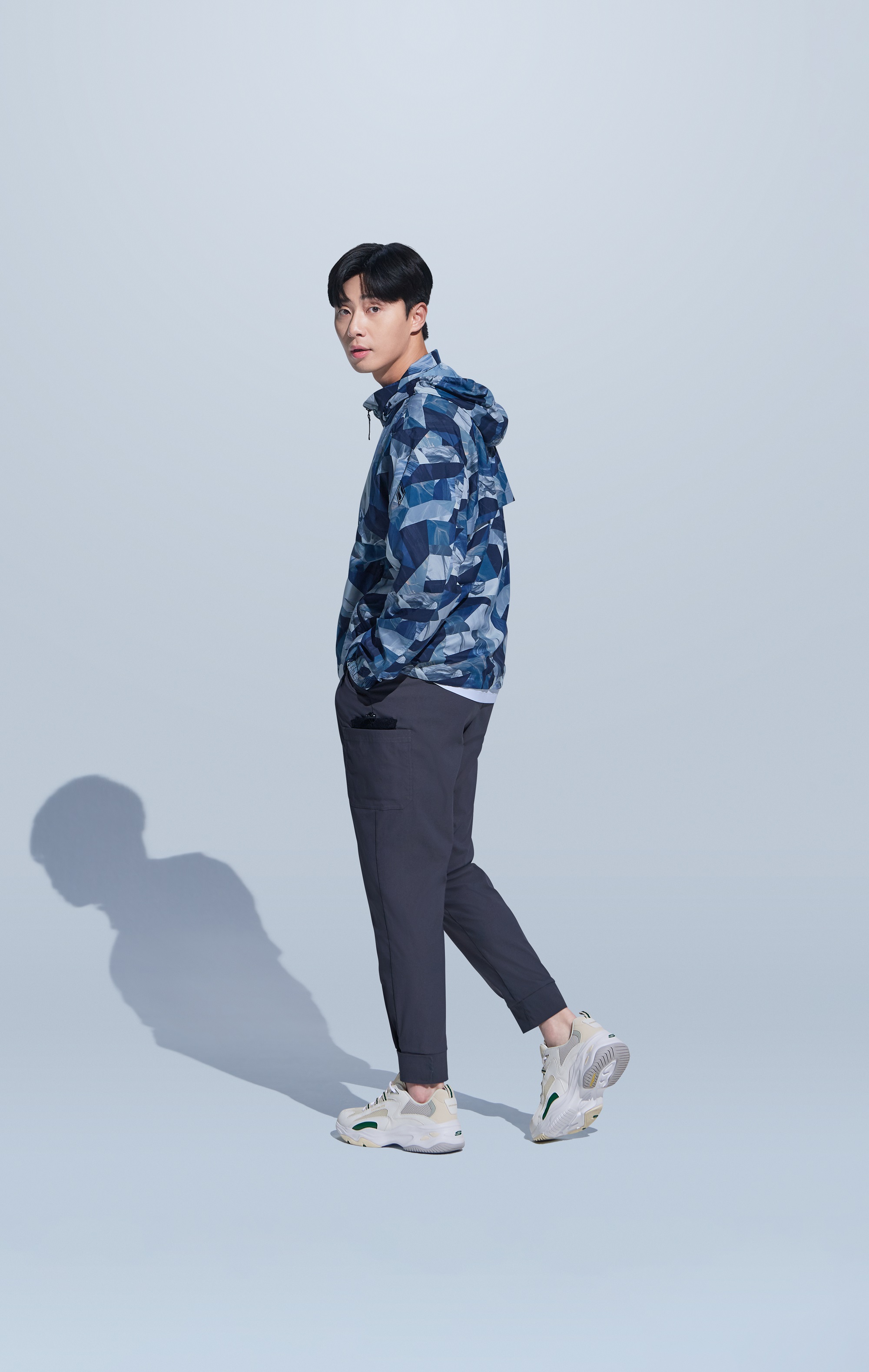 是次推出新款具備女裝及男裝,韓國男星朴敘俊穿上鞋身以淡黃色為主色、以鮮綠色作點綴的新鞋款,配搭機能風的服飾,展現率性街頭風。