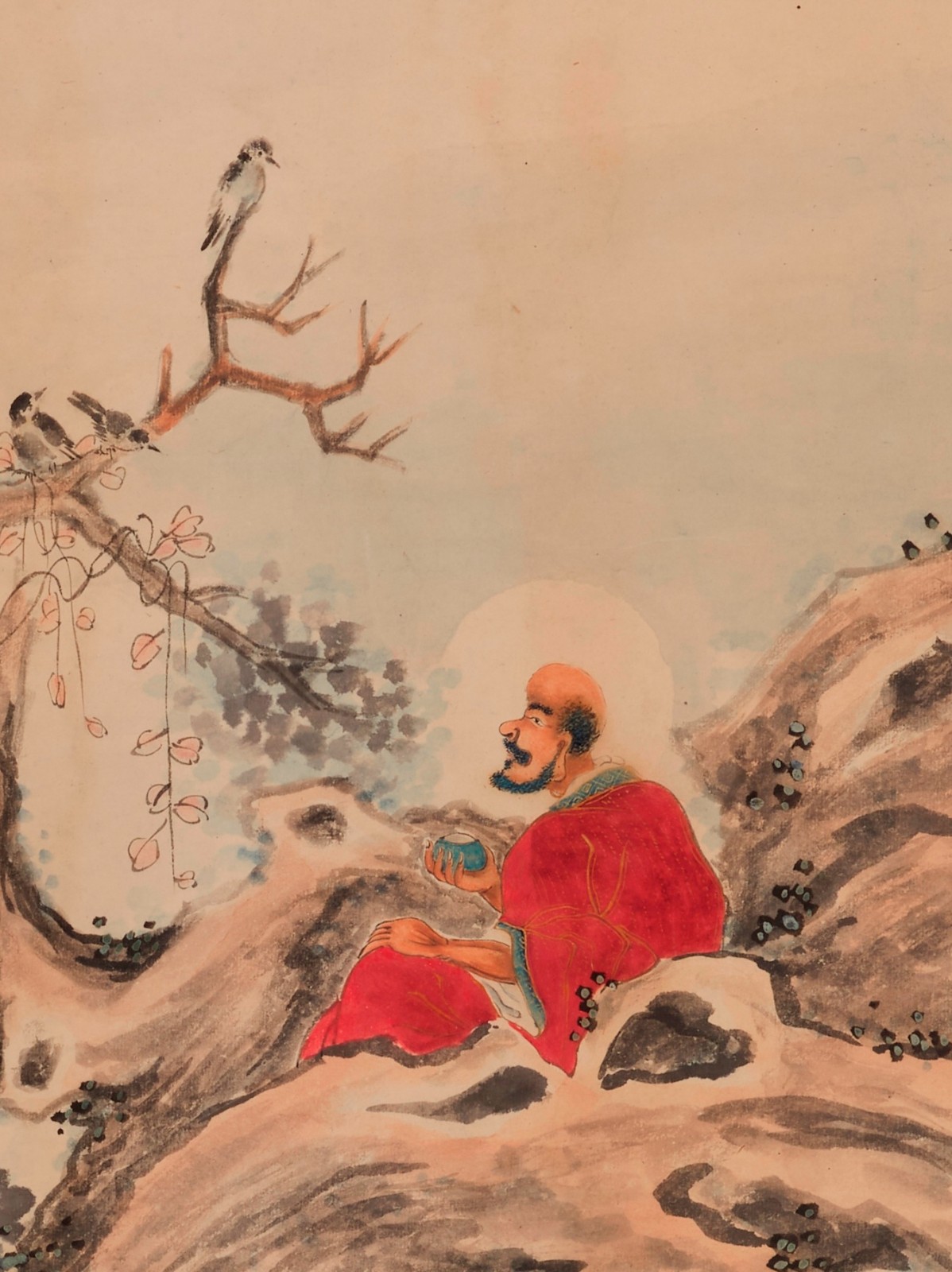 錢化佛畫作格局出入宋畫,人物取法梁楷、陳老蓮,樹法多用丁雲鵬、吳彬畫法,可謂師出有門。畫中紅衣羅漢坐於懸空巨木間,前額高凸,虯鬚密髯,但眉目慈祥,面含笑意,有慈悲之感。開臉不同於清末民初畫家慣常的開臉法,具有寫實意味。樹木盤根錯節,山石青綠相間,羅漢一襲紅衣的朱砂色用得尤為精妙。藤蔓纏繞在枝幹上,為畫面增添幾許線性的靈動;墨筆點出茂密的樹葉,濃淡深淺皆有層次。畫面色彩搭配和諧,加上潺潺流水,更是超凡出塵,觀之令人身心舒暢。