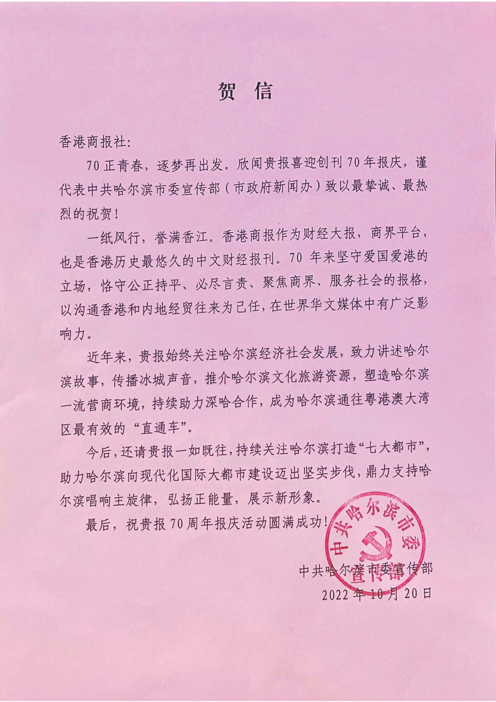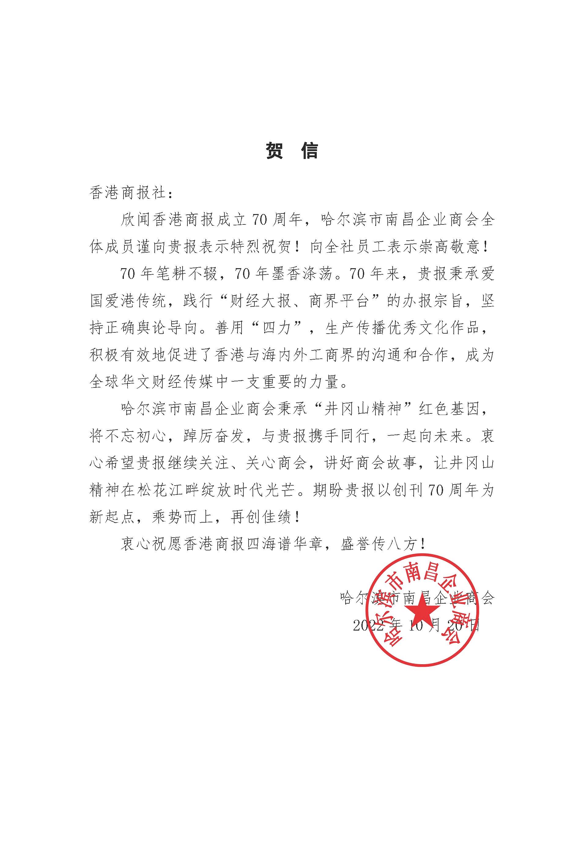 在《香港商報》創刊70周年之際,中共黑龍江省委宣傳部、中共哈爾濱市委宣傳部、哈爾濱市南昌企業商會近日特發來賀信,致以熱烈而誠摯的祝賀。