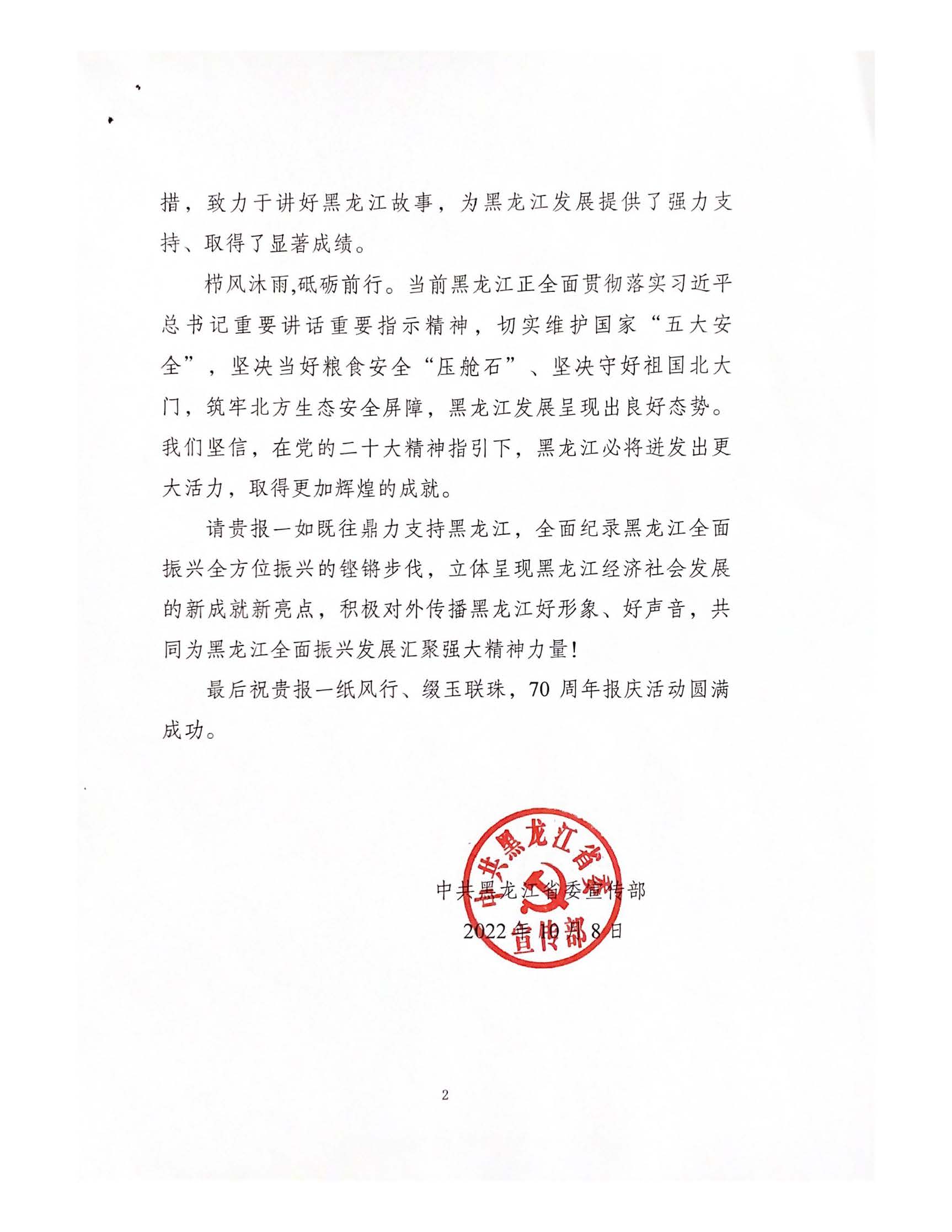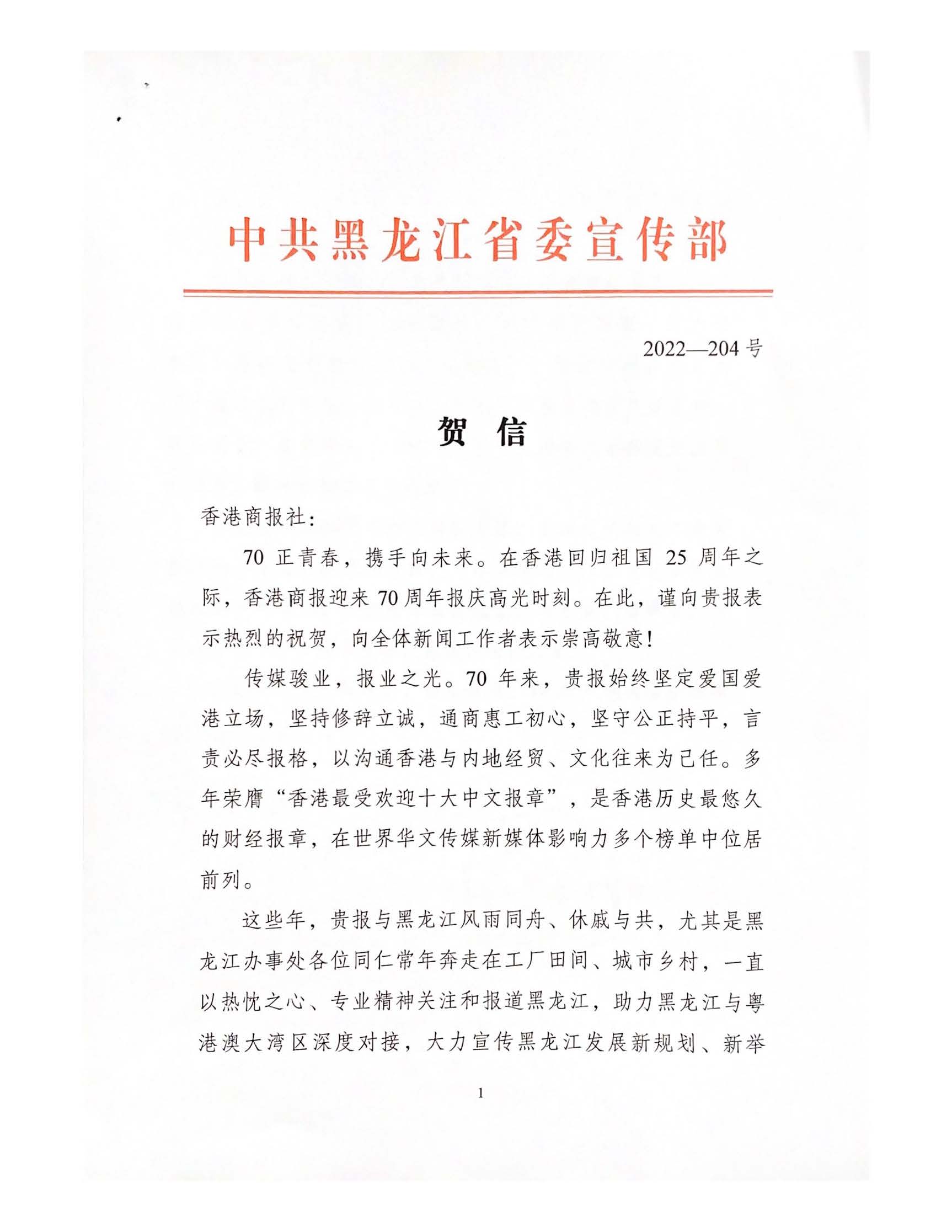 中共黑龍江省委宣傳部在賀信中寫道:「70正青春,攜手向未來。在香港回歸祖國25周年之際,香港商報迎來70周年報慶高光時刻。在此,謹向貴報表示熱烈的祝賀,向全體新聞工作者表示崇高敬意!」
