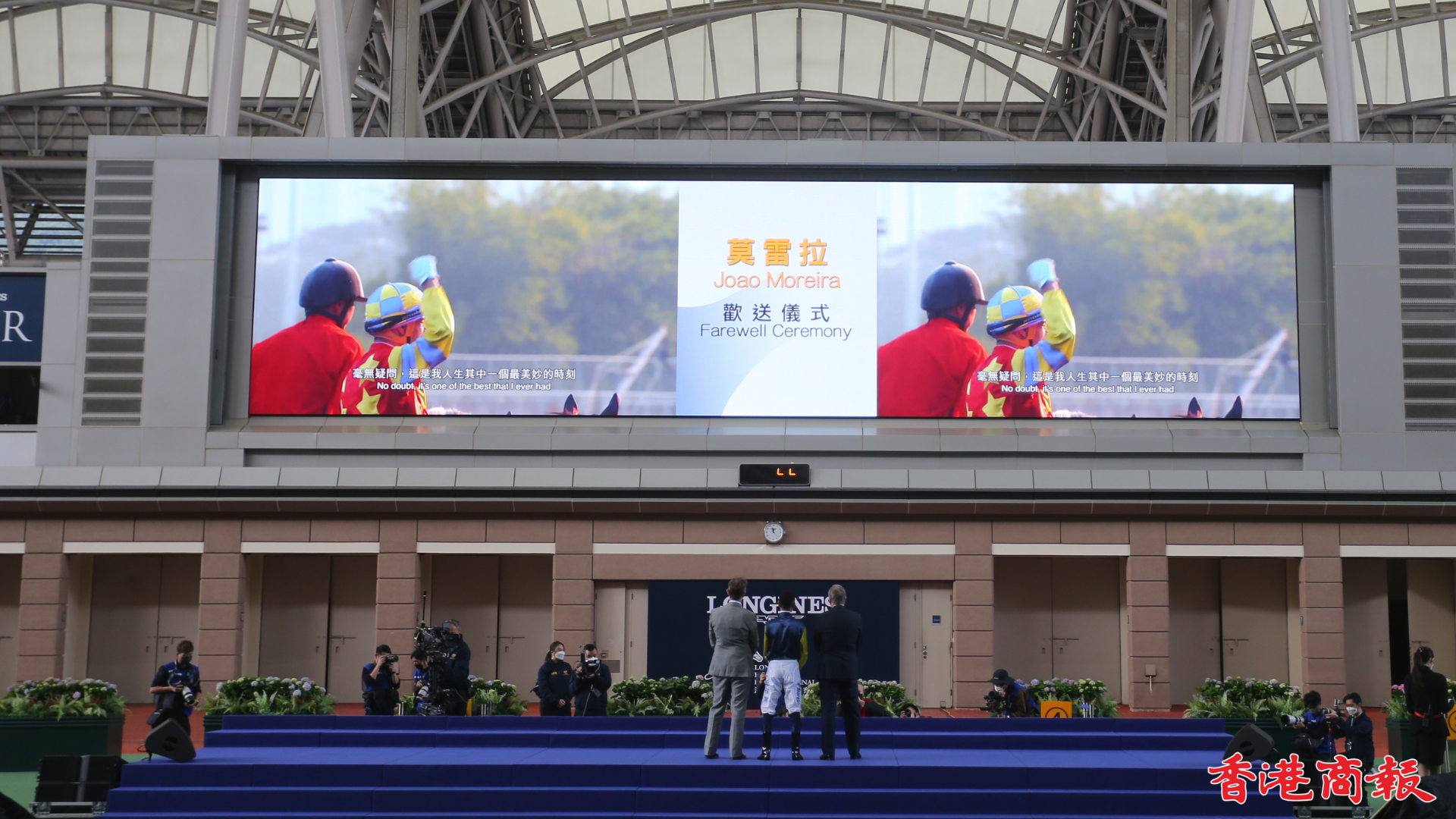 在歡送儀式上,大屏幕會播放了莫雷拉過去在港策騎的精彩片段。雷神表示,在港策騎生涯中留下不少難忘回憶、以及開心片段,他同時感謝馬會給予自己機會可以在港出賽。(志誠 攝)