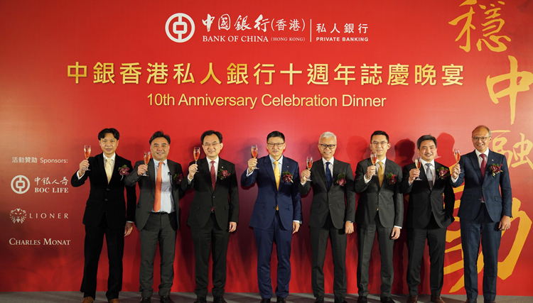 頂圖:中銀香港私人銀行為慶祝成立10周年,在香港故宮文化博物館舉行「中銀香港私人銀行10周年誌慶晚宴」。中銀香港副董事長兼總裁孫煜(左四)、香港故宮文化博物館館長吳志華博士(右四)、中銀香港副總裁陳文(左三)、中銀香港私人銀行董事總經理甘宇文(右一)、中銀集團人壽保險有限公司銷售網絡主管蔡毅航(左一),聯同主要業務合作夥伴Lioner International Consultancy Limited合夥人陳家俊(右三)及陳東源(右二)、Charles Monat Associates Limited亞太區行政總裁黃國維(左二)在晚宴上主持祝酒儀式。
