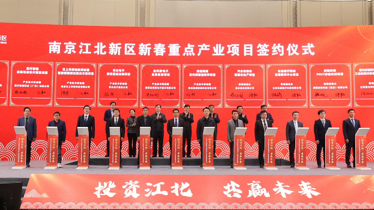 頂圖:1月31日,「投資江北 共贏未來」南京江北新區新春重點產業項目簽約儀式舉行。27個項目成功簽約,投資總額243億元。(江北新區供圖)