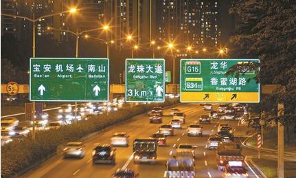 頂圖:深圳市交通運輸局近日在北環大道香梅路至福龍路試點應用的「發光」路牌,夜間視覺效果更清晰。深圳特區報記者 劉羽潔 攝