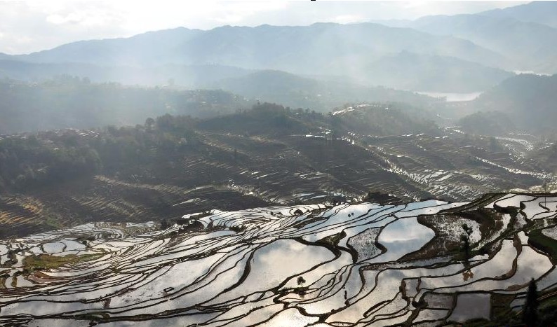 雾霭中波光粼粼、气象万千的万亩他撒梯田景观。初冬,云南省红河哈尼族彝族自治州红河县哈尼族世代居住的哀牢山中16万亩哈尼梯田开始蓄水泡田,准备耕作。乐育、宝华、甲寅等乡村依山势逶迤磅礴的连片梯田在云遮雾罩中时隐时现,气象万千,独特的地貌景观吸引众多游客前来观景、拍照。