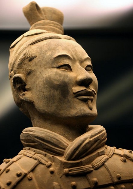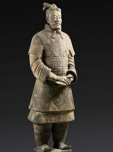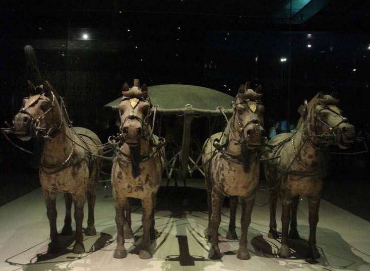 1974~1977年在秦始皇陵东1千米处,发掘出作为秦始皇陵陪葬墓坑之一的兵马俑坑。-号坑在南,东西长216米,宽62米,面积13260平方米。二号坑东西长124米,宽98米,面积为6000平方米。三号坑面积520平方米。已发掘部分,共出土武士俑800件,木质战车18辆,陶马100多匹。按兵马俑现有排列形式推算,这三个坑的武士俑可能有7000件,战车100辆,战马100匹。由模拟的军阵,可以想见二干多年前横扫六国,统一全国,所向披靡的秦国军队的威武强大。陶佣身材高大,一般在1.8米左右,形态各异,表情逼真,面部形态无一雷同,栩栩如生。体现了秦代高超的雕塑技艺水平。