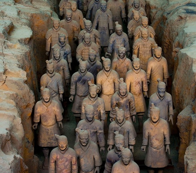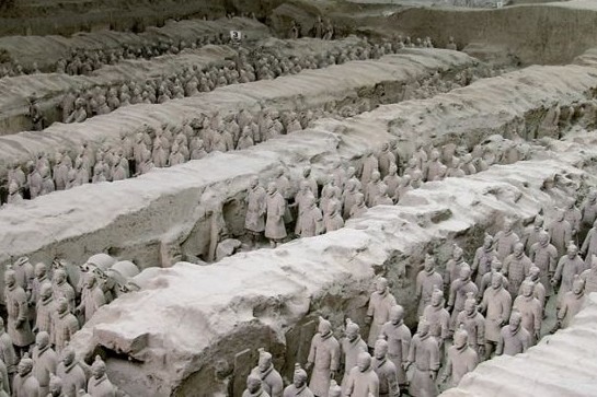 秦始皇兵马俑陪葬坑,是世界最大的地下军事博物馆。俑坑布局合理,结构奇特,在深5米左右的坑底,每隔3米架起一道东西向的承重墙,兵马俑全部面向东方排列在墙间空档的过洞中。